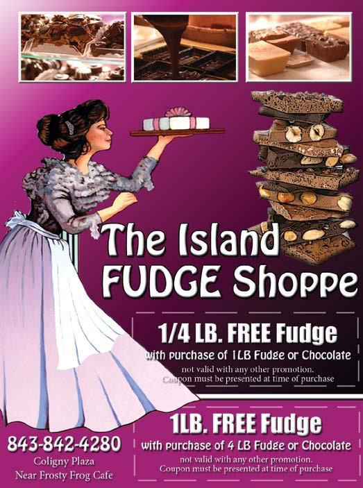 ISLAND FUDGE SHOPPE Located in Coligny Plaza. The best homemade confections anywhere. Offering16 flavors of fudge made fresh daily, 8 flavors of saltwater taffy and a large variety of hand dipped chocolates sure to please even the sweetest tooth. Gift baskets and shipping available. Locally owned and operated. Senior citizens receive a 10% off discount. Call (843) 842-4280 for more information or check us out online at www.islandfudge.com.