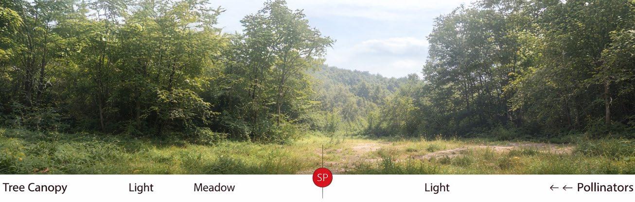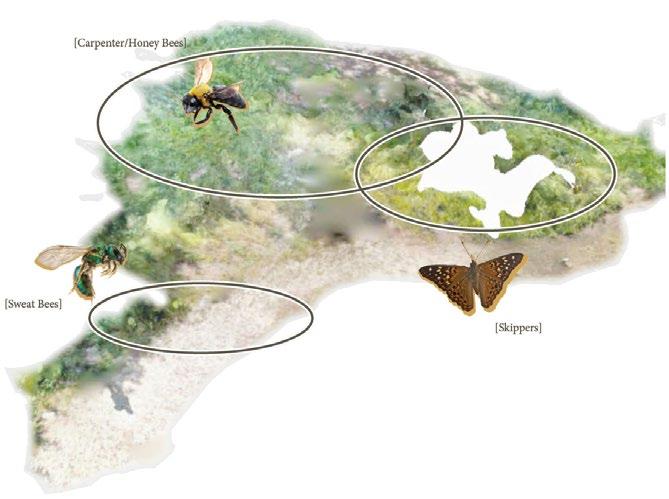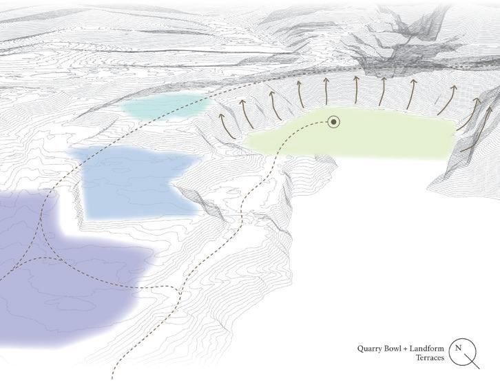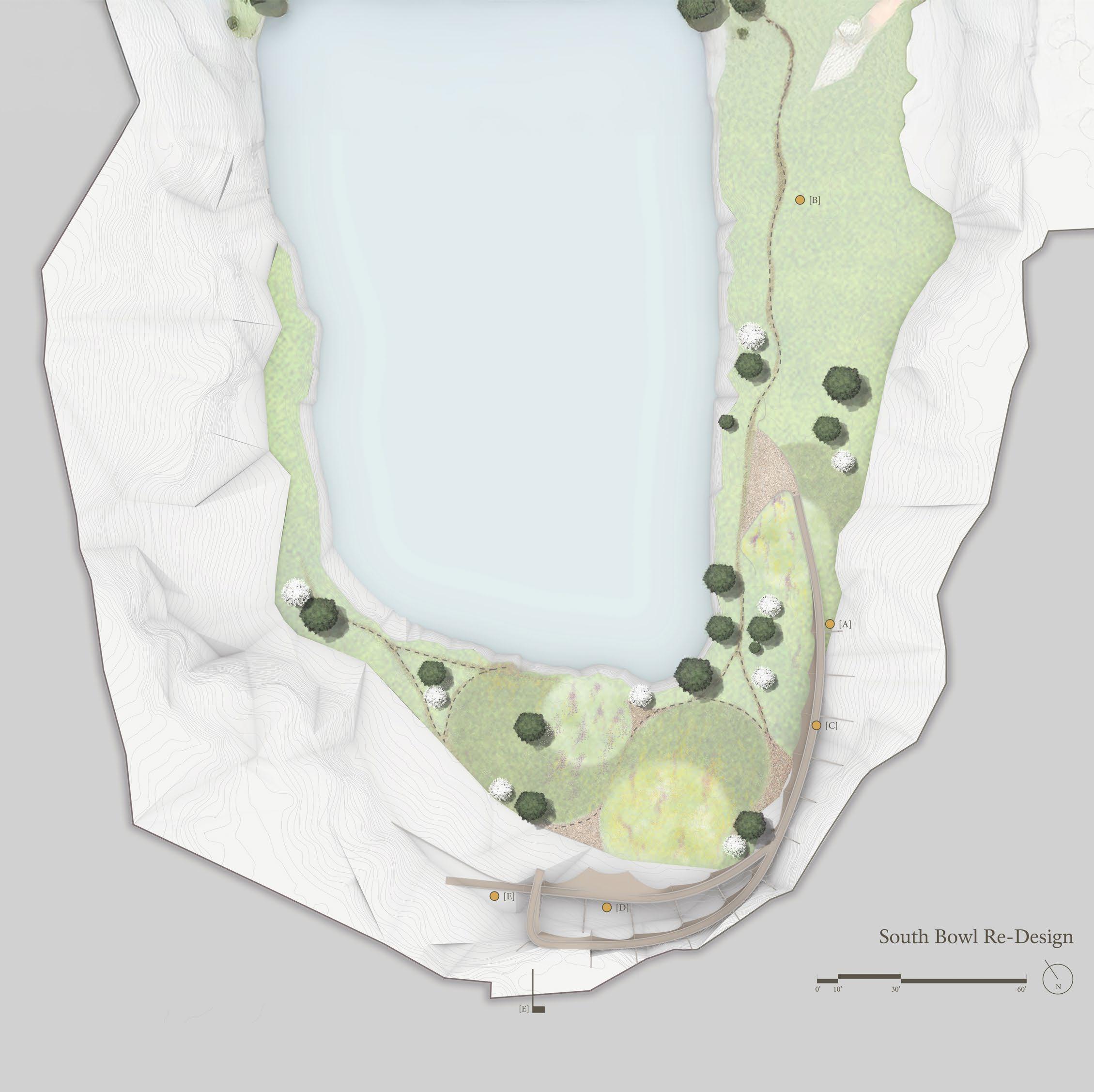 Through the study of native vegetation zones and pollinator movement patterns, areas of sensitive ecological activity were identified and prioritized for preservation. These findings informed the redesign of a key connector within the park’s trail network. To reduce human impact within critical zones while maintaining familiar circulation paths and highlighting the quarry’s distinctive viewpoints, the project proposes a tensile bridge that clings to the quarry bowl’s rock face, linking lower and upper trail systems.