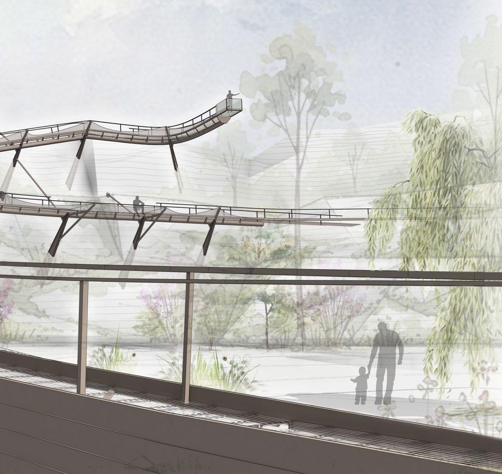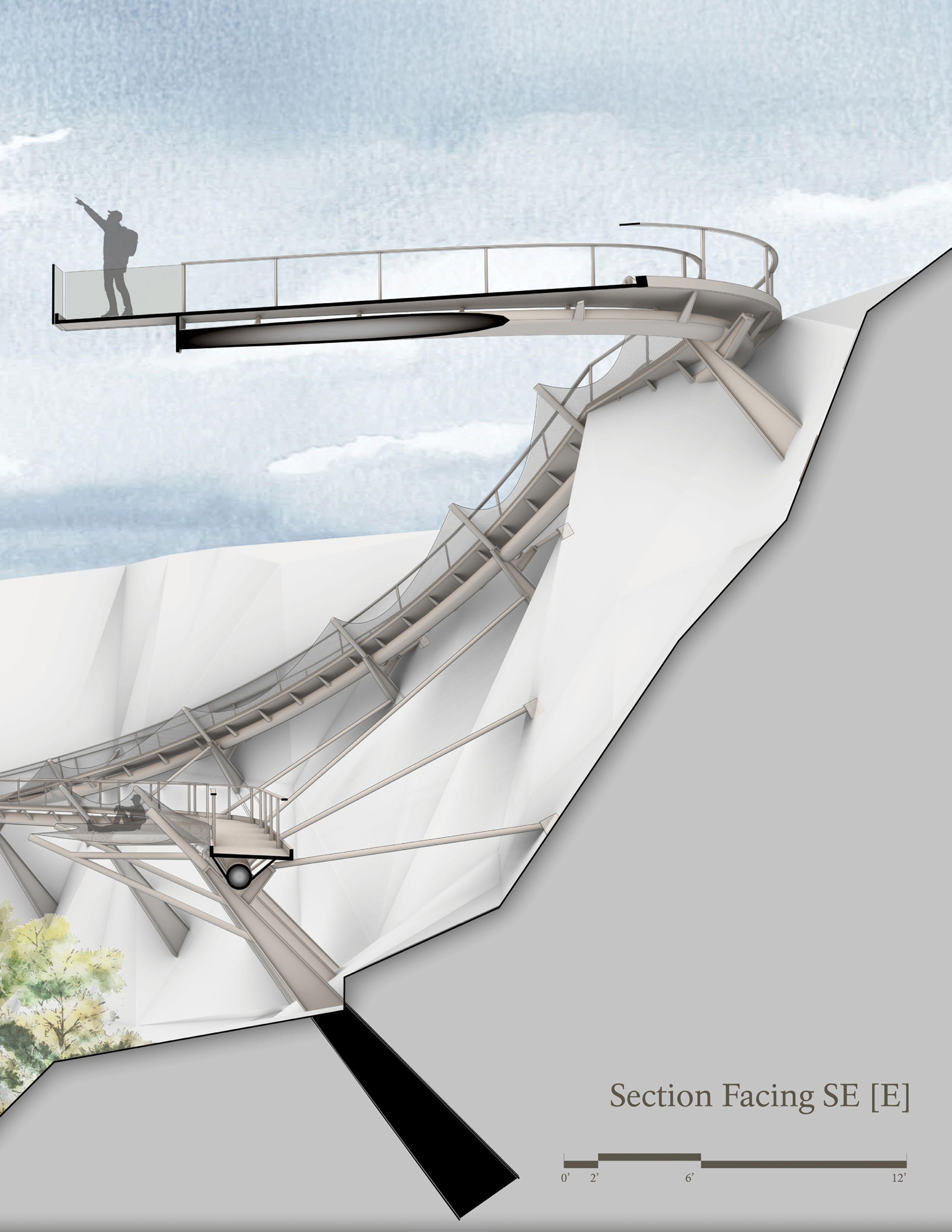 Fickle Path adds a connecting piece to the high foot traffic park trails of Mead’s Quarry, at Ijams Nature Center near Knoxville’s urban core. The current park trails are segmented by steep shifts in terrain and require trekking through sensitive meadows dispersed throughout the park. The trail bridge carefully considers the territorial boundaries between pollinators and park visitors by reclaiming scarred post-industrial space to preserve critical zones above and below the rock face.