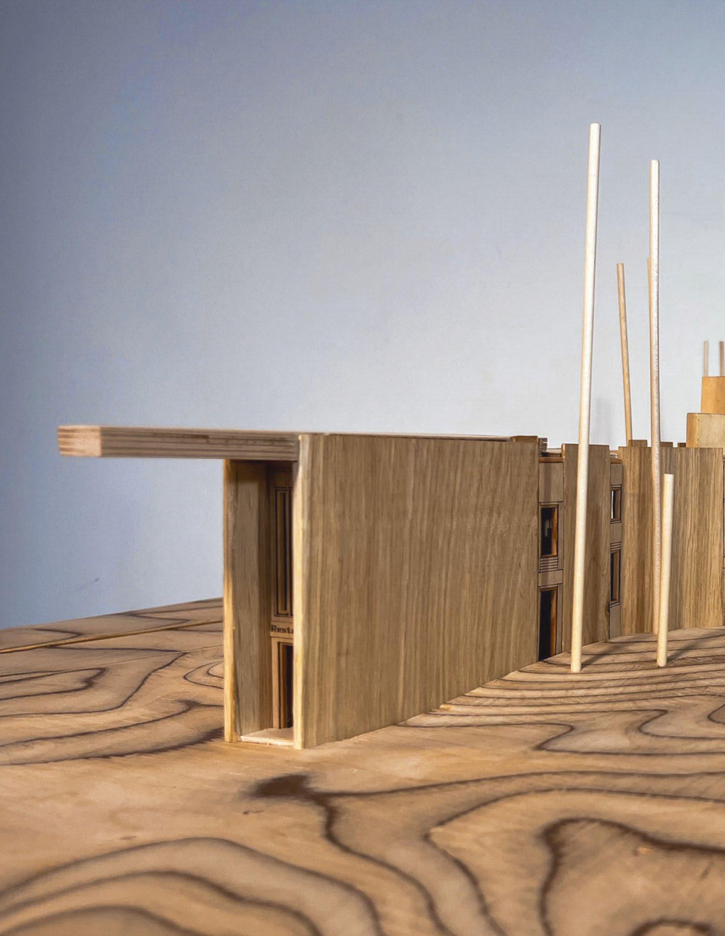 The production of a museum-quality, large-scale model was supported by digital workflows, with drone point cloud mapping, Rhinoceros, the Adobe Creative Suite, and CNC software serving as primary tools for fabrication. Through hand drafting and model-making, the project examined Finnish design thinking, materiality, and craft embedded in the building’s form and construction. The work strengthened technical skills and the value of architecture as a cultural artifact. The project is as much of a celebration of Urdsgjallar as it is a professional-level record intended for exhibition and long-term academic use.