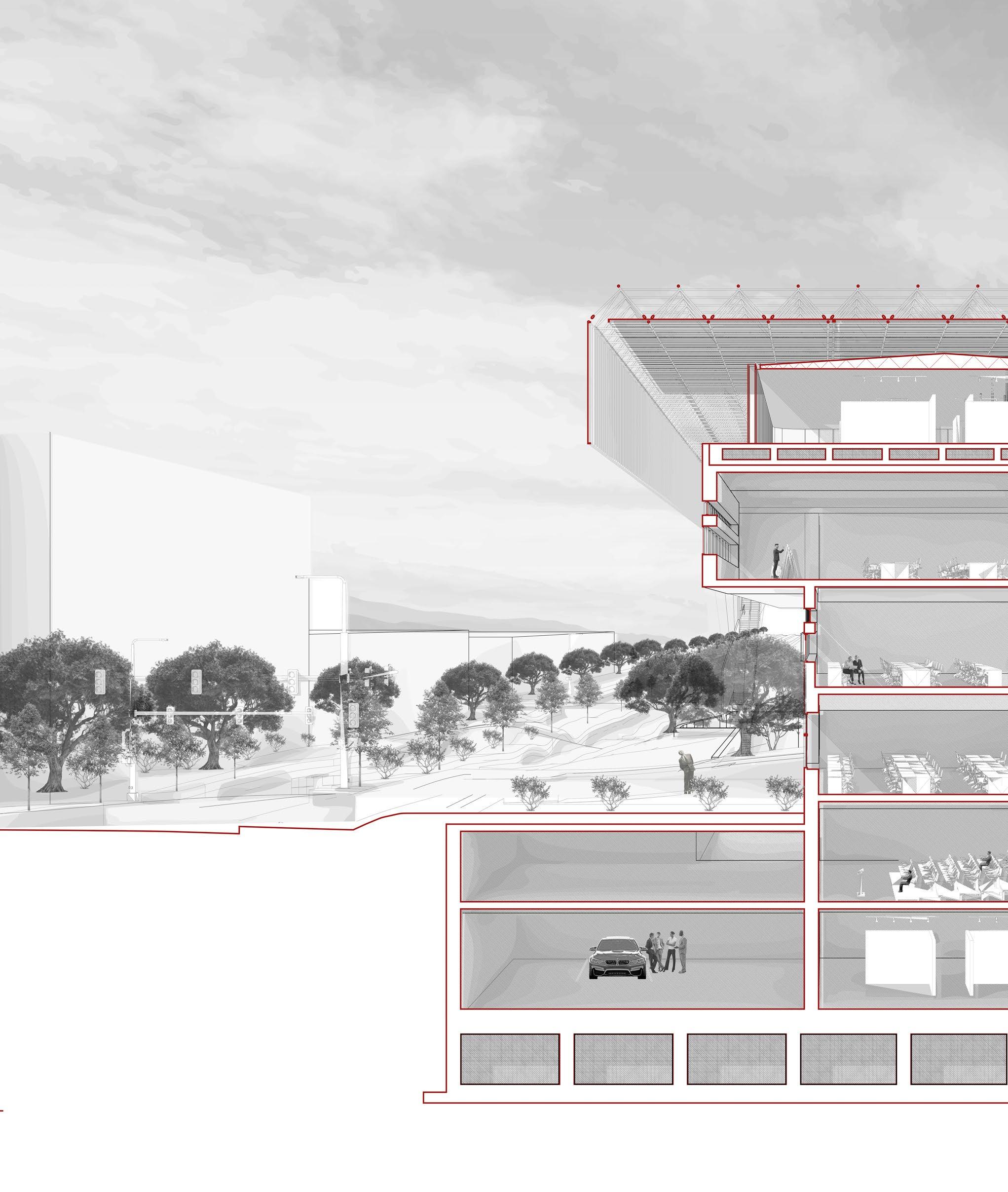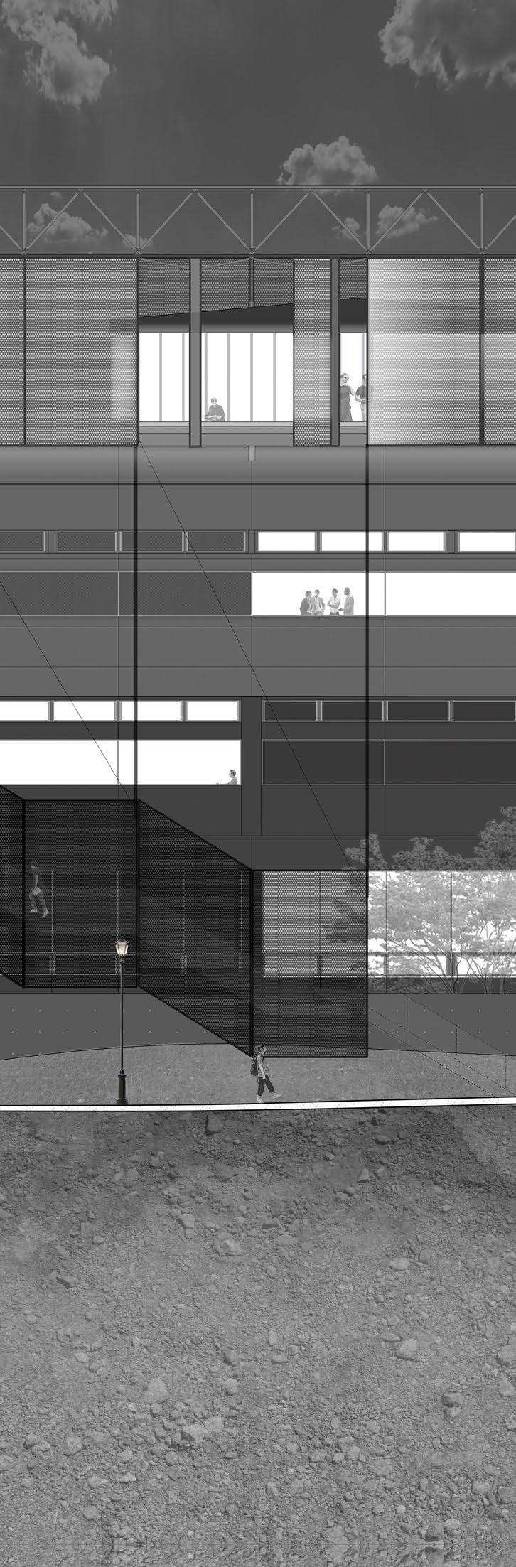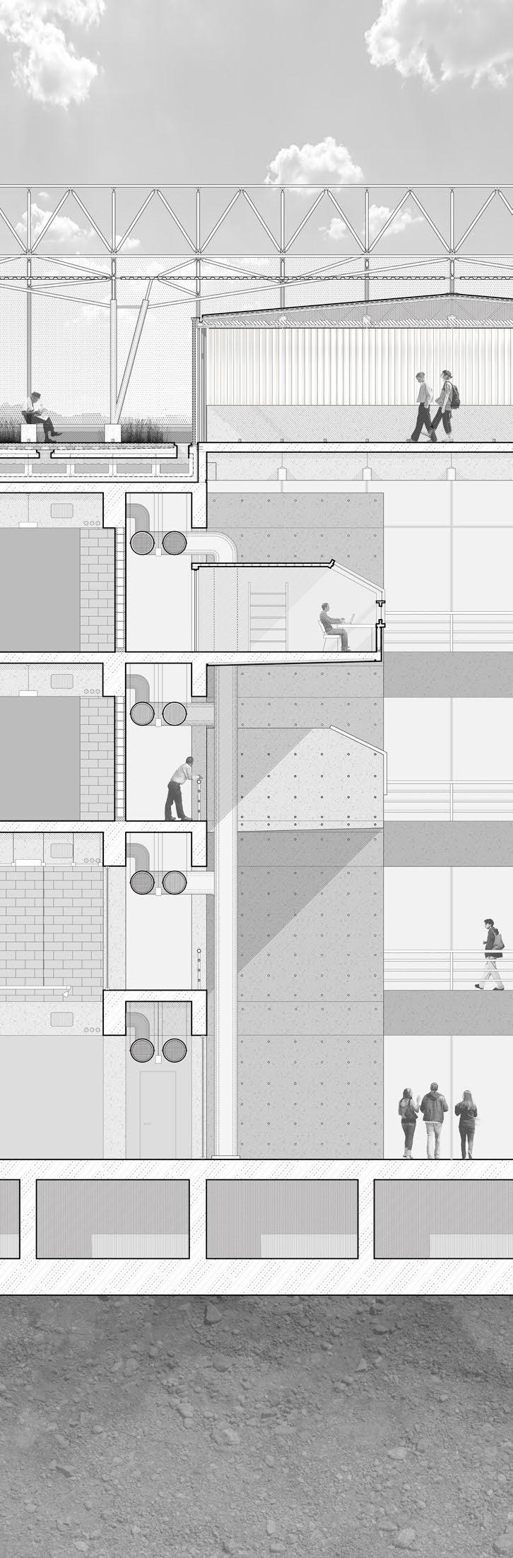 Roofscape is a renovation and expansion proposal for the Art and Architecture Building at the University of Tennessee. The project reclaims underutilized areas of the existing building to accommodate a growing academic community through new faculty offices, exhibition and meeting spaces, visiting scholar residences, garden rooms, and expanded parking. Beyond accommodating programmatic growth, the proposal prioritizes a climate-responsive agenda towards updating and expanding the existing building.