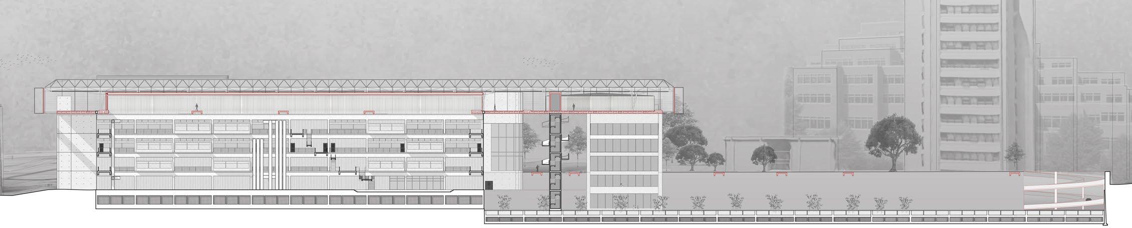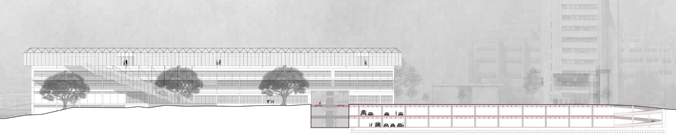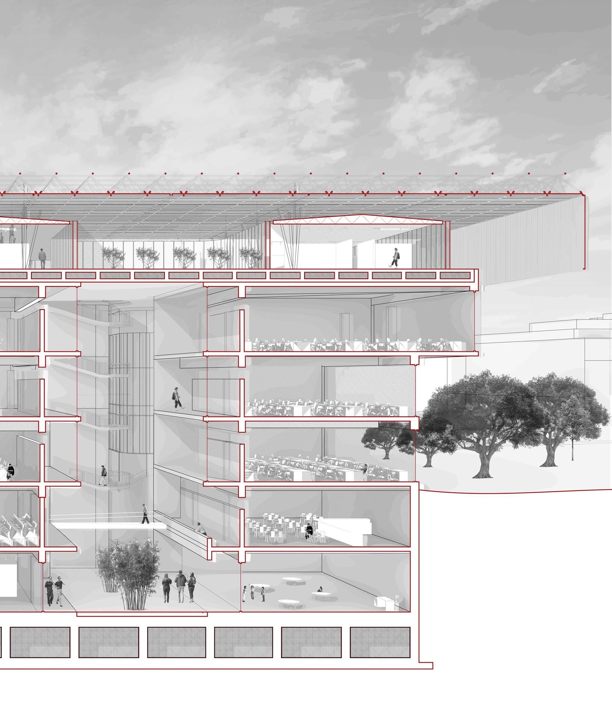Roofscape is a renovation and expansion proposal for the Art and Architecture Building at the University of Tennessee. The project reclaims underutilized areas of the existing building to accommodate a growing academic community through new faculty offices, exhibition and meeting spaces, visiting scholar residences, garden rooms, and expanded parking. Beyond accommodating programmatic growth, the proposal prioritizes a climate-responsive agenda towards updating and expanding the existing building.