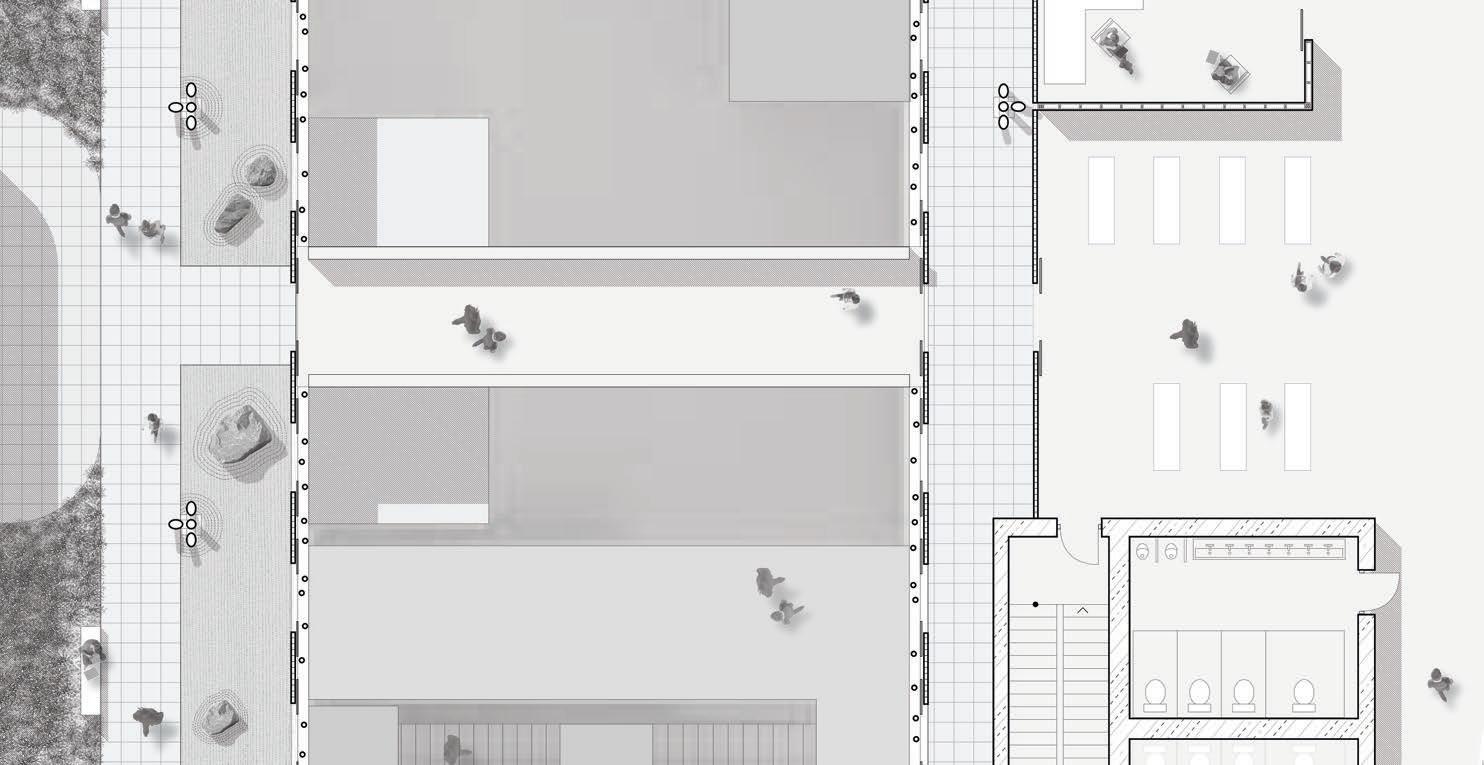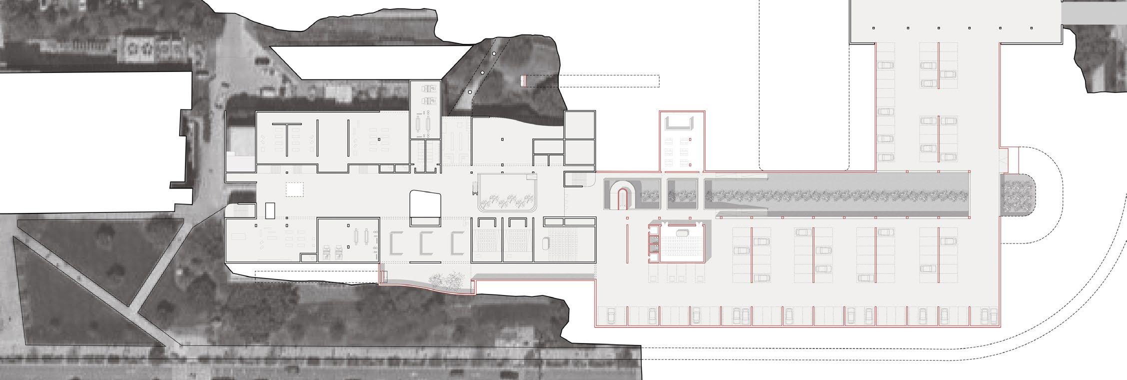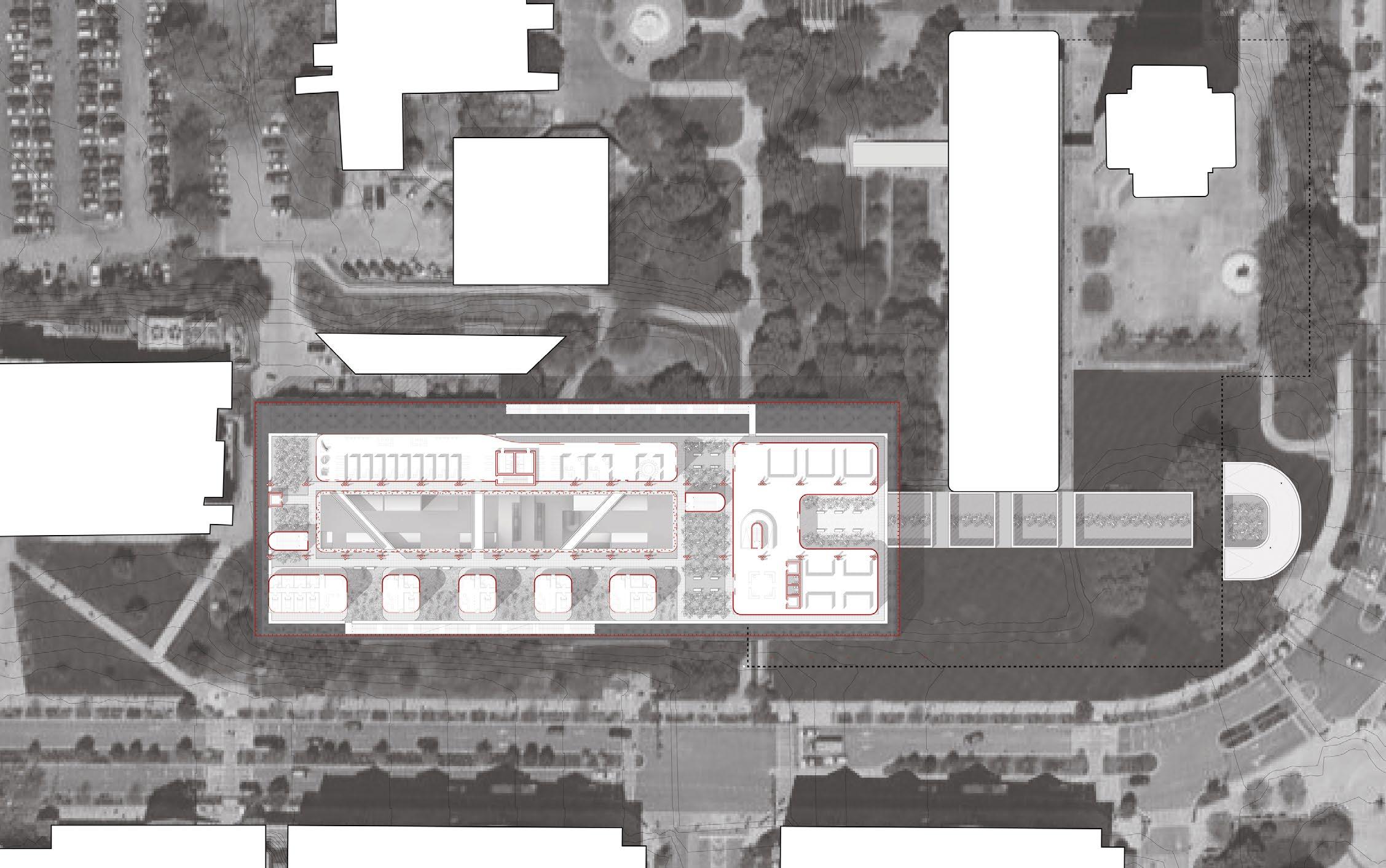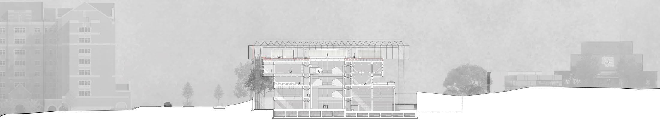 At the campus scale, a speculative volume east of the A+A is introduced for a future School of Art, housing academic, exhibition, dining, and childcare programs while unifying existing and new buildings through rooftop connections and a consolidated parking system. The parking structure connects to McClung Plaza Garage, sharing ventilation, daylight, and green space.