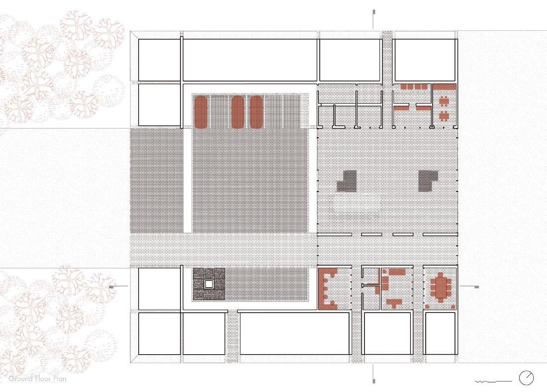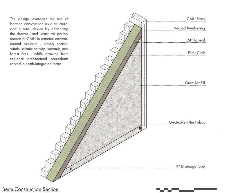 A key design strategy is the use of bermed construction, which adds thermal mass and protection to the concrete masonry unit (CMU) structure under extreme environmental conditions. The project’s identity stems from local architectural traditions of using earthwork for the durability, protection, and efficient operation of buildings.