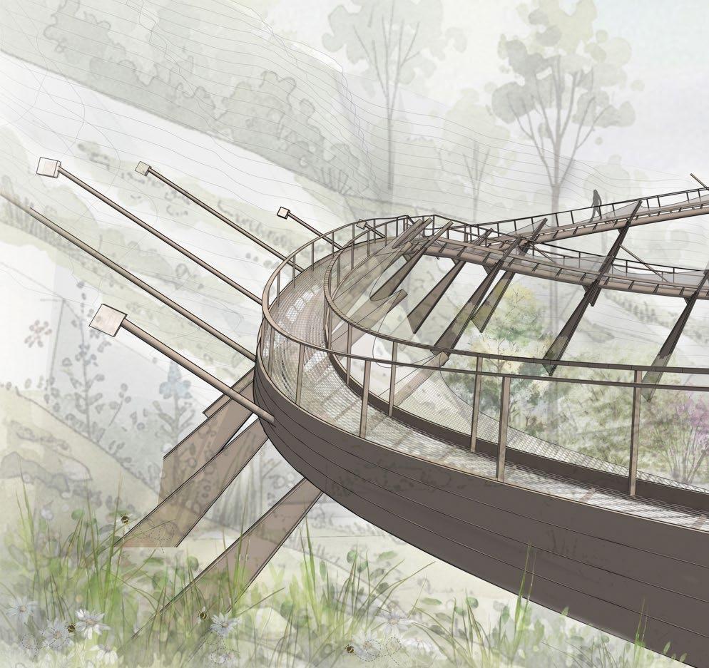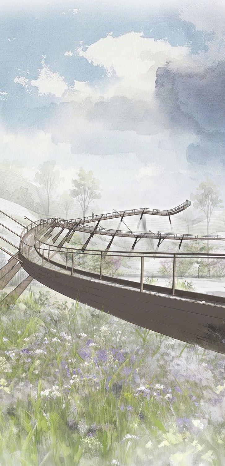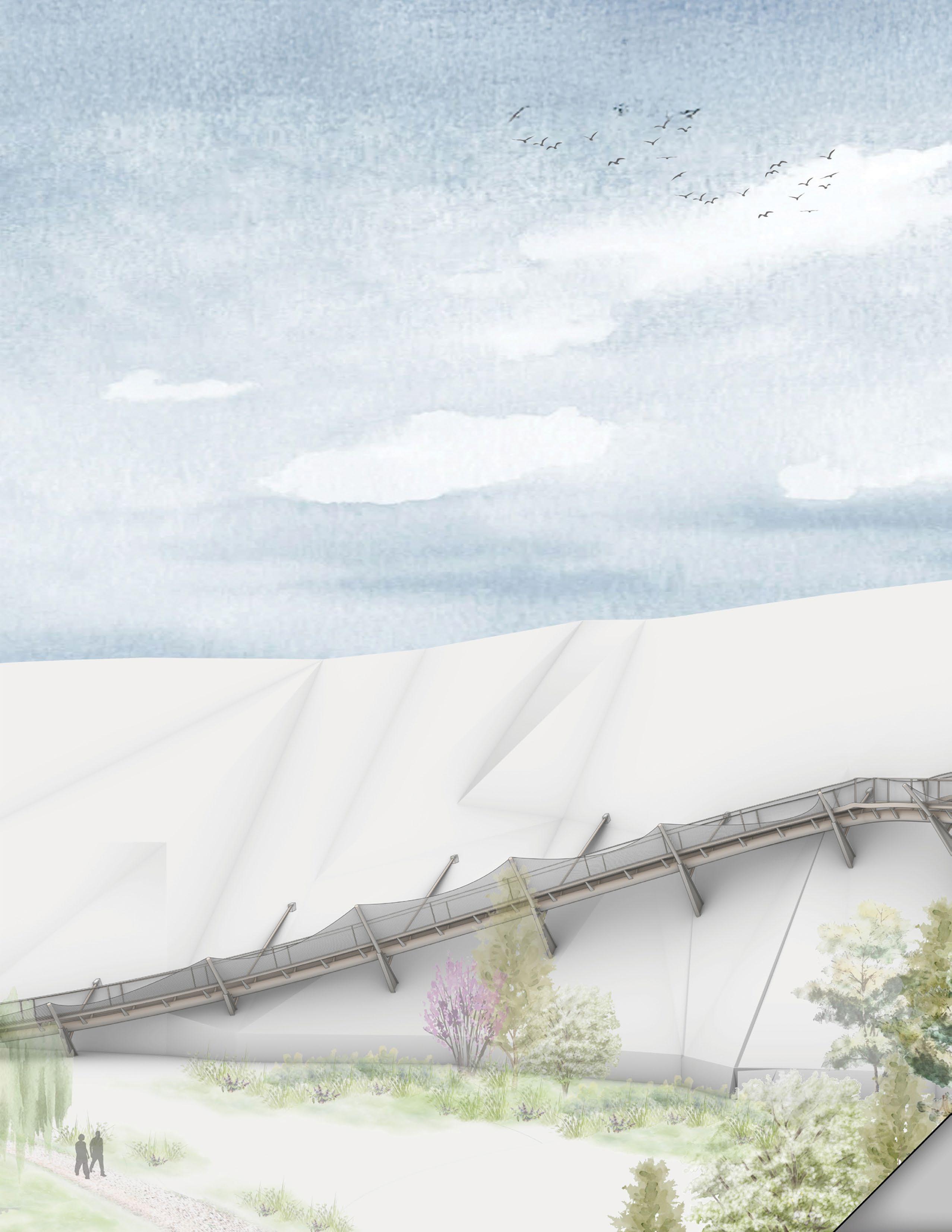 The site is currently characterized by dense kudzu growth along steep, terraced quarry walls formed by industrial extraction. The bridge’s structural logic draws inspiration from the taproots of these invasive vines, which aggressively anchor themselves into inhospitable terrain. By reinterpreting this strategy, the bridge acts as a deliberate parasitic intervention - one that replaces an ecologically harmful presence with an architectural element designed to facilitate mindful movement, protect sensitive habitats, and encourage more responsible engagement with this unique urban landscape.