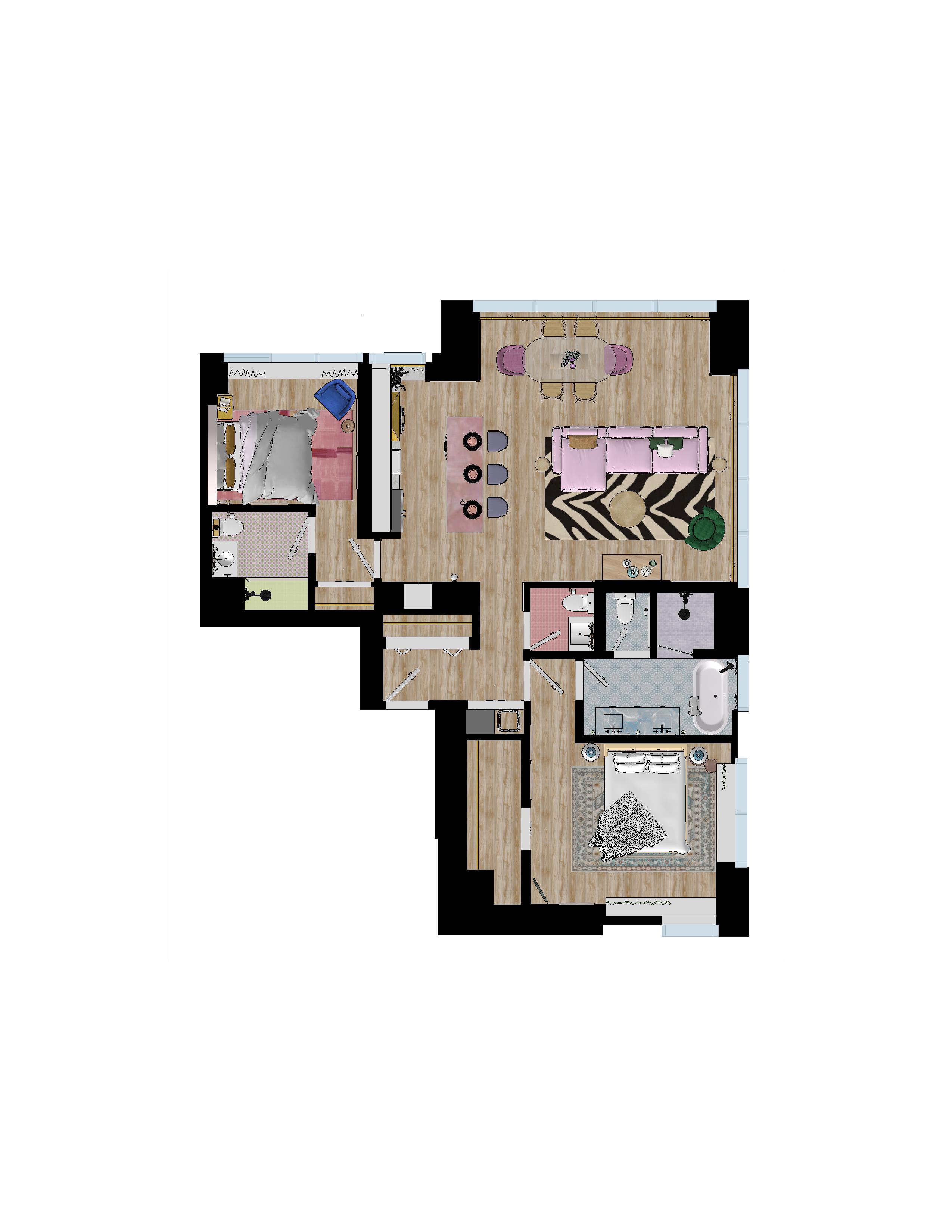 The concept, aptly named Eclectic Enclave, celebrates the fusion of their individual styles. As two recent college graduates stepping into life in the big city, Eden and Peyton wanted their apartment to feel like a reflection of themselves—a place where modernity meets whimsy and creativity thrives. The living room became the perfect example of their blended approach, combining Eden’s sleek, contemporary furniture with Peyton’s love for cozy textures and vibrant hues. This harmonious mix resulted in a welcoming gathering space, ideal for hosting dinners, parties, and their beloved Bachelor watch nights.