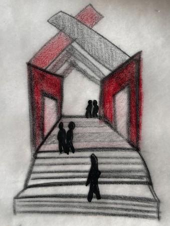 La escalera fragmenta el espacio y lo atraviesa en diagonal, formando una terraza que eleva el el espacio de circulación y permite el abalconamiento