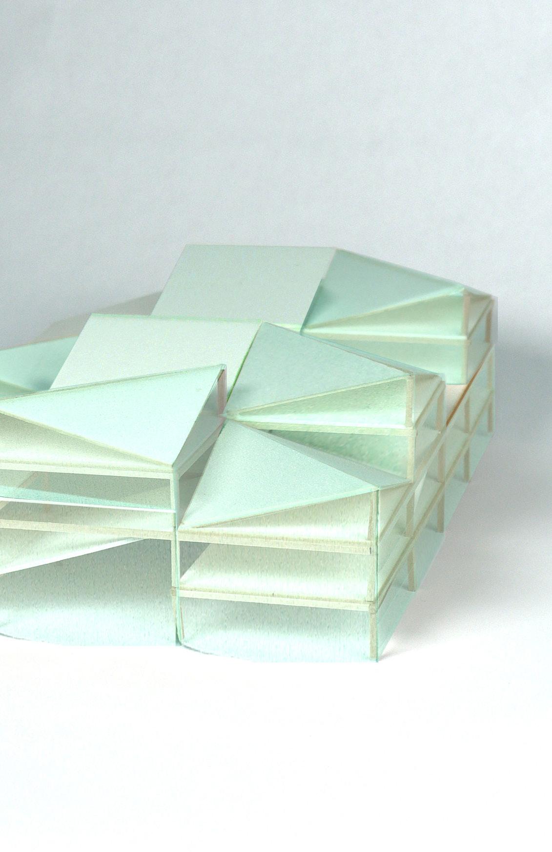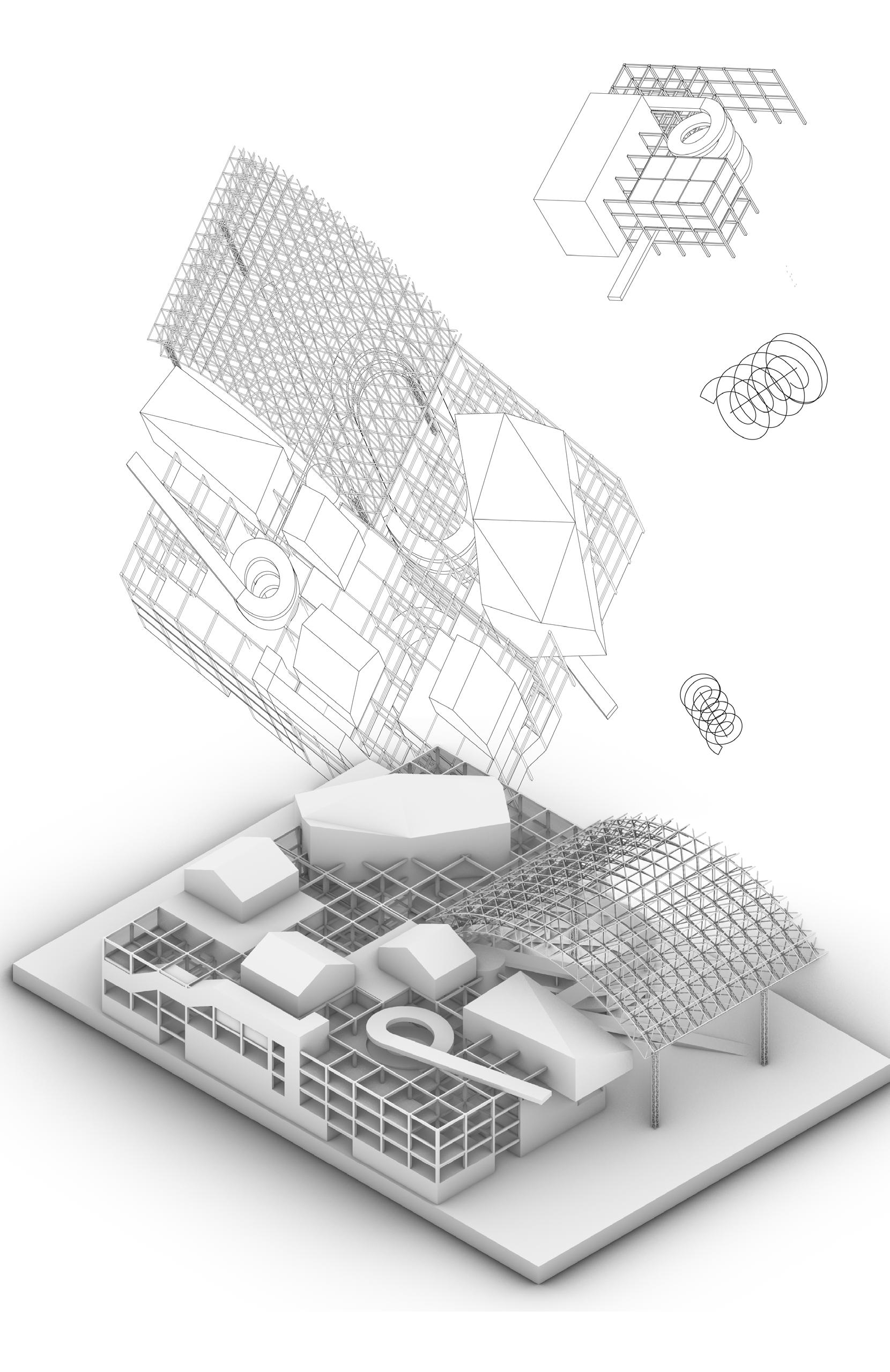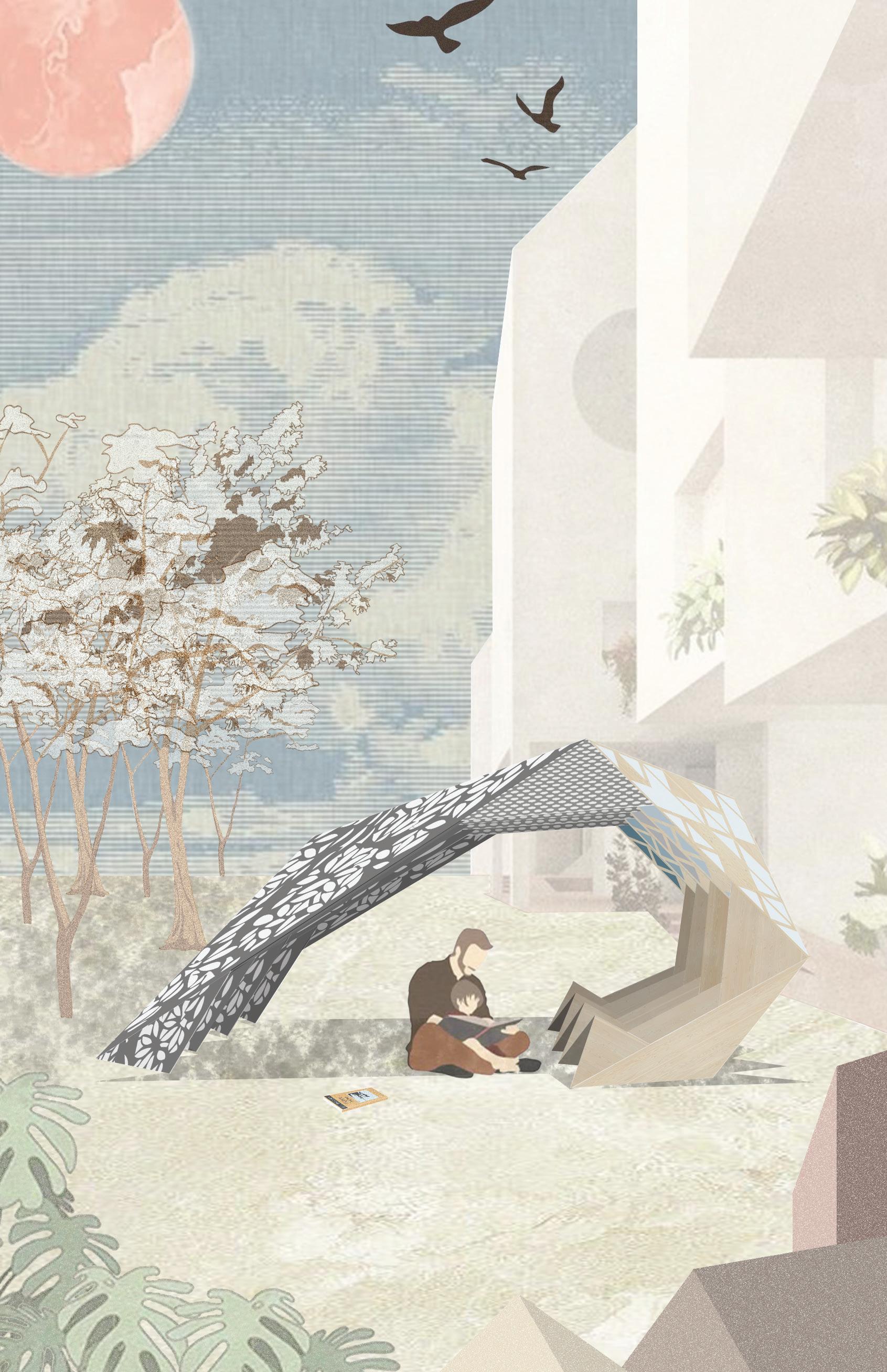 The project proposes a folded architectural structure that creates a small reflection space within the landscape. Folding operates as both a spatial and ethical strategy, allowing the structure to be portable, deployable, and reversible while maintaining a light footprint. Inspired by the act of pitching a tent, the structure is not simply encountered as a finished object but understood through its assembly. It encourages direct engagement between user, material, and site. The form follows a spiraling geometry, transitioning from a grounded, structural base to a more porous upper canopy that filters light. Integrated seating supports stillness rather than movement, positioning the structure as a place to pause, observe, and reflect within the landscape.