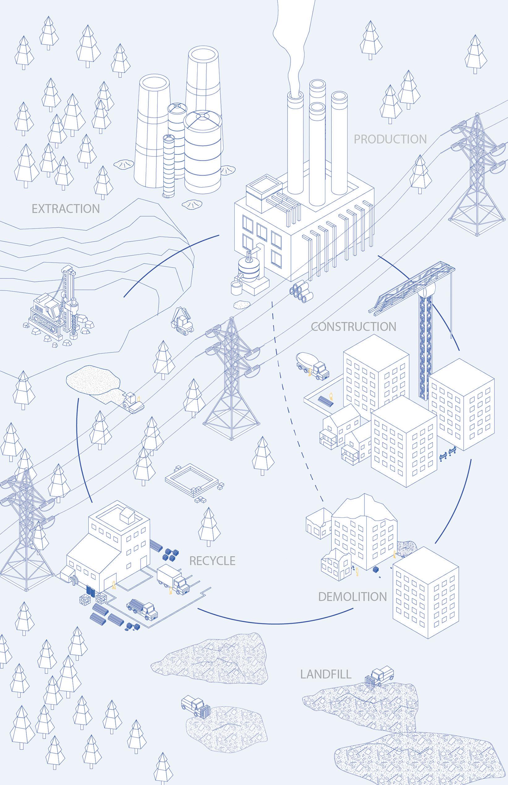 A holistic understanding of our surroundings is created by analyzing local building materials and emphasizing smaller circular economies. By fostering an alternative practice of care in communities, the built environment becomes a social catalyst through direct material influence. A material field guide analyzes where materials are harvested, produced, and transported and where they end up after demolition. The production manual addresses key agents in building with policy and systems of material reuse. The set of resources challenges the way architects, builders, and citizens navigate growth.