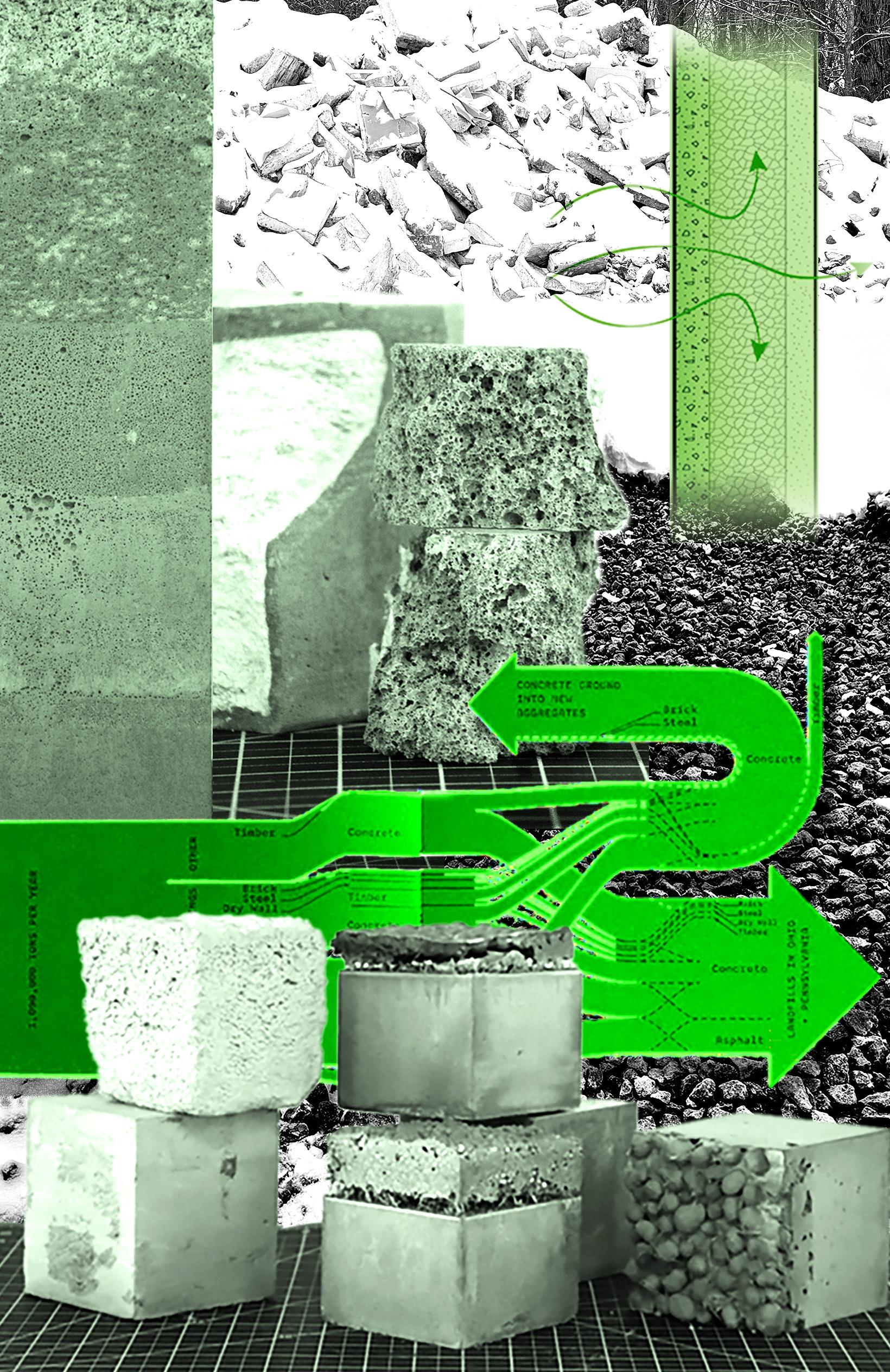 Brandon Clifford writes in The Cannibal’s Cookbook, “The city grows upwards with intrepid velocity. It stops at nothing to grow more, make new, eradicate old.” The current demolition and recycling systems largely reinforce a culture of downcycling, in which material value is progressively reduced. Second Cast proposes a material strategy intended to disrupt this cycle. Greater value is argued to exist with resources that have already been extracted. Within the building industry, new systems of collection, sorting, reuse, and processing therefore can be developed to extend the life and utility of existing material stock. Building upon this premise, Second Cast is a material strategy leveraging and utilizing varying concrete densities, coalesced into a new way of making building components. Our project combines recycled concrete rubble with foamcrete and non-autocalve aerated concrete (NAAC) to create building components that add acoustic and thermal properties.