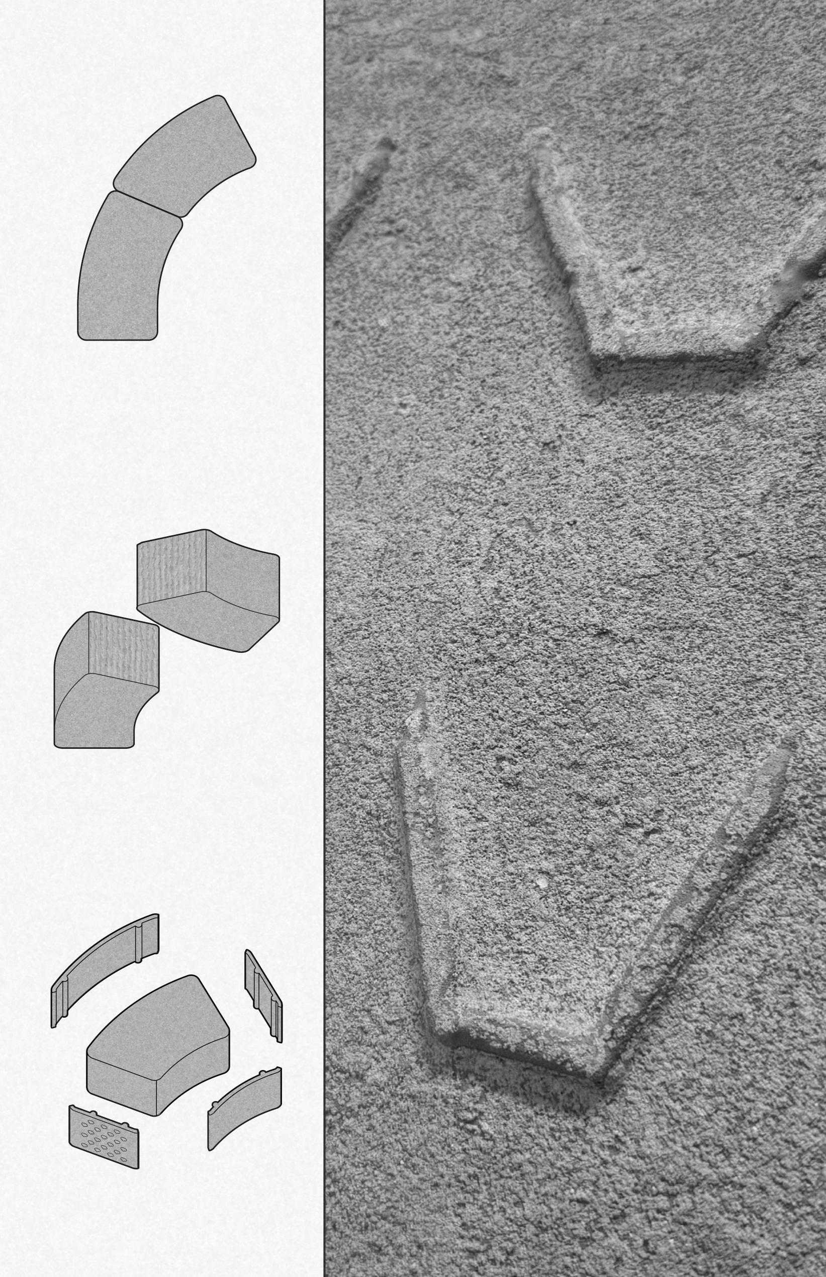 Textured Interfaces leverages sand casting through the creation of stackable components with custom corresponding textured surfaces. These surfaces, tuned to ensure non-sliding behavior by the friction between textures, offer the possibility of stable stacking at extreme angles that would not be possible with traditionally smooth mass-produced concrete molded surfaces. Empirical testing, combined with the computational analysis of components’ center of mass, enables easier assembly possibilities without scaffolding support to take place. These self-supporting units reduce the time, labor, and material needed, especially for scaffold construction, whereby a keystone arch can be assembled without the falsework.