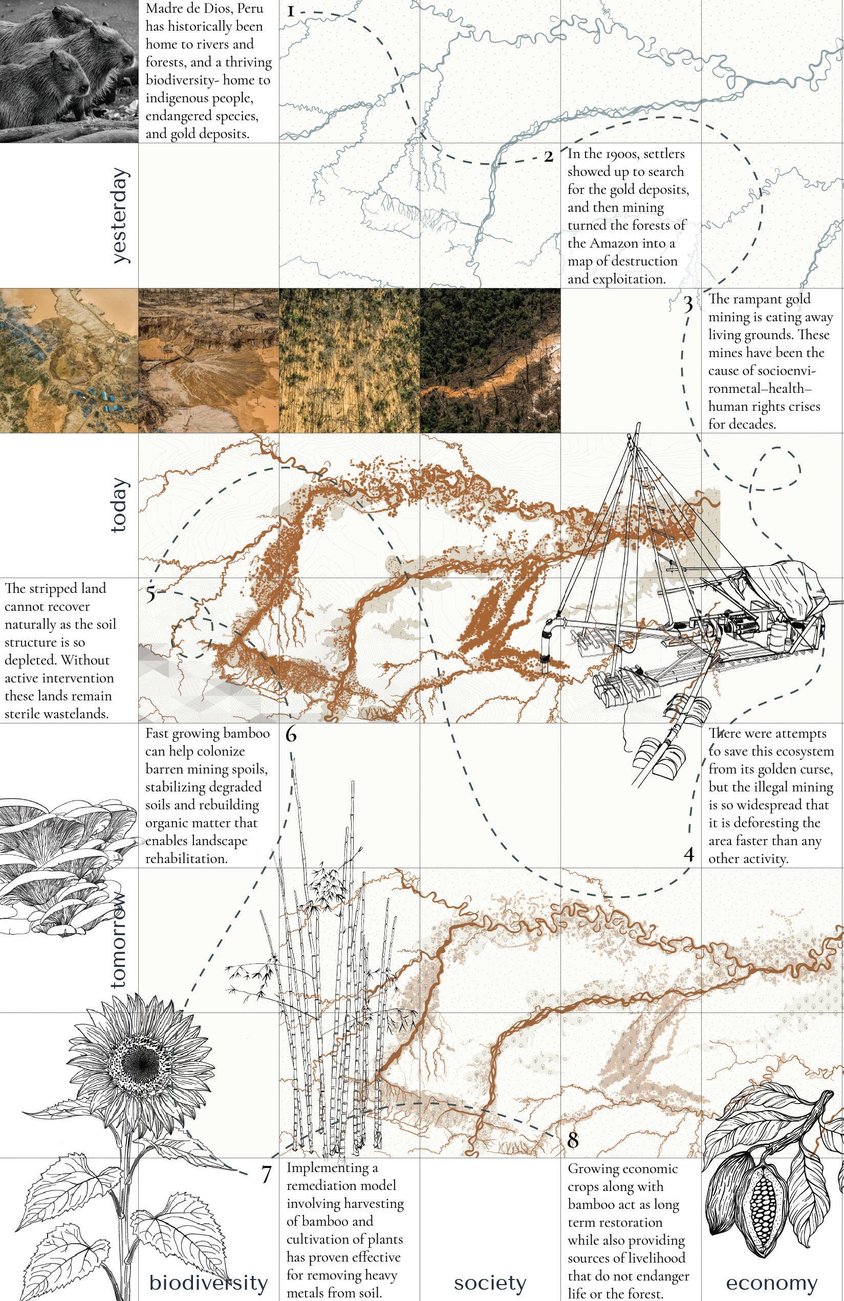 In post- extraction landscapes, remediation and rehabilitation can take back the craters and pits, replacing them with thriving ecosystems. Sarah Jaquette Ray states, “a bleak picture is just one side of the story”. Contrary to the model of extraction, rehabilitation is as much an act of social and economic justice as an ecological imperative. Considering the degraded nature of post-mining soils, restoring the landscape that once existed is no longer an efficient model. Peter Del Tredici expresses that the critical question to be addressed is not “What plants grew in the past?” but “What will grow there in the future?” Bamboo is proposed as a radical pioneer species for post-mining remediation for the environmental services it can offer while also empowering impacted communities.