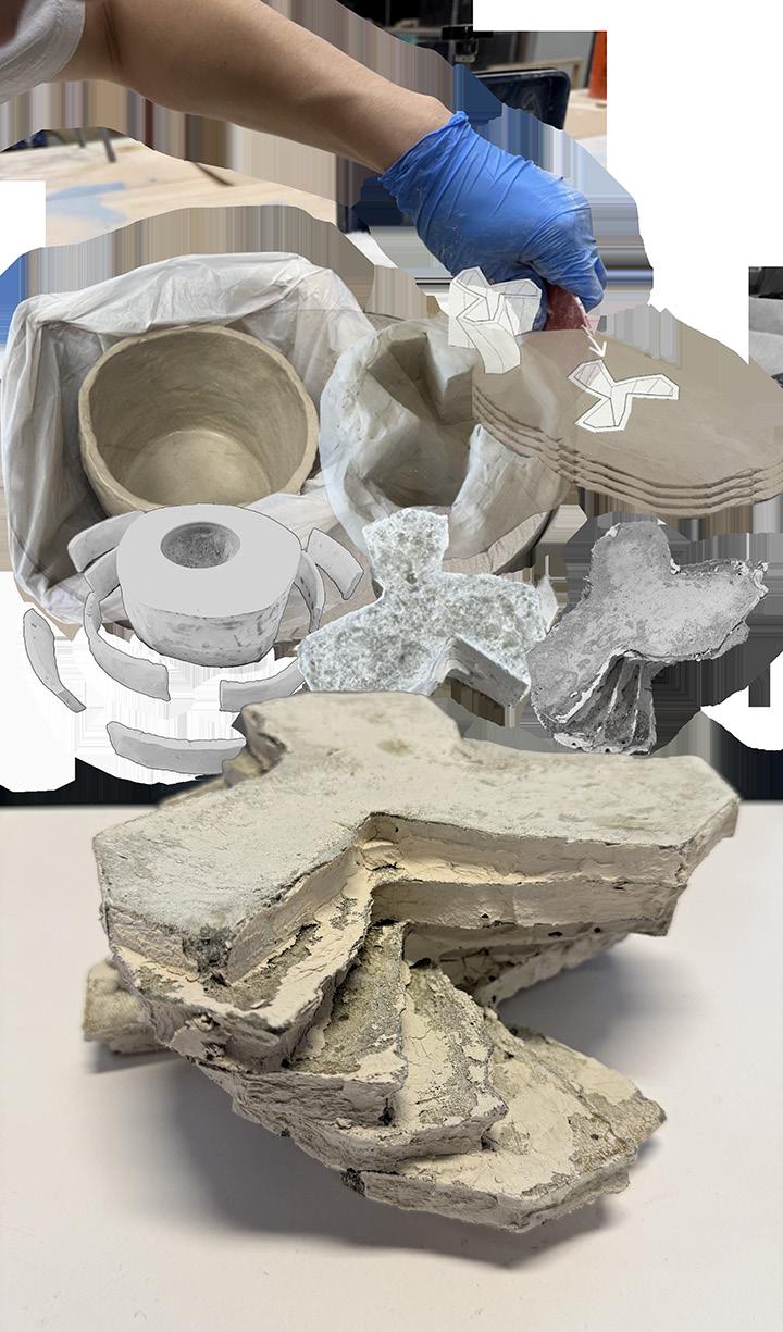 Working with clay also reveals the relationship between gravity, stability, and form. Because each layer depends on the support of the one below, the mold must negotiate balance and structural integrity as it grows vertically. This condition turns a simple manual technique into a study of incremental construction, material behavior, and the negotiation between structural stability and formal expression.