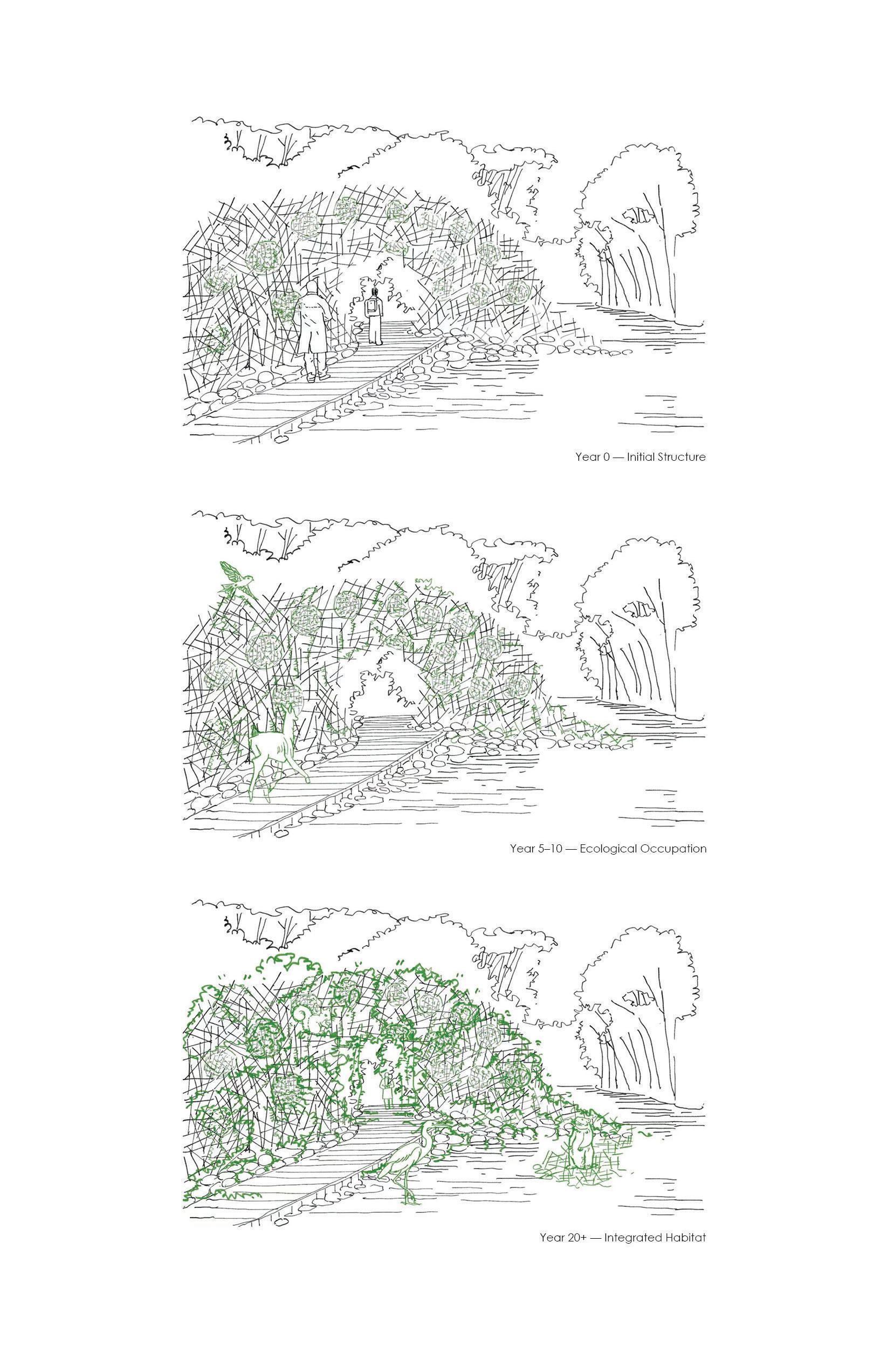 At the intervention scale, the architecture takes the form of a porous scaffold between terrains, enabling movement and exchange among light, air, water, plants, and animals. Initially open and undefined, it supports human use while allowing ecological processes to emerge. Over time, the structure is shaped by multi-species interactions. Plants, animals, and environmental forces inhabit and extend the structure over time, through accumulation, feedback, and adaptation. Architecture thus becomes an evolving, relationship-driven condition rather than a finished object.