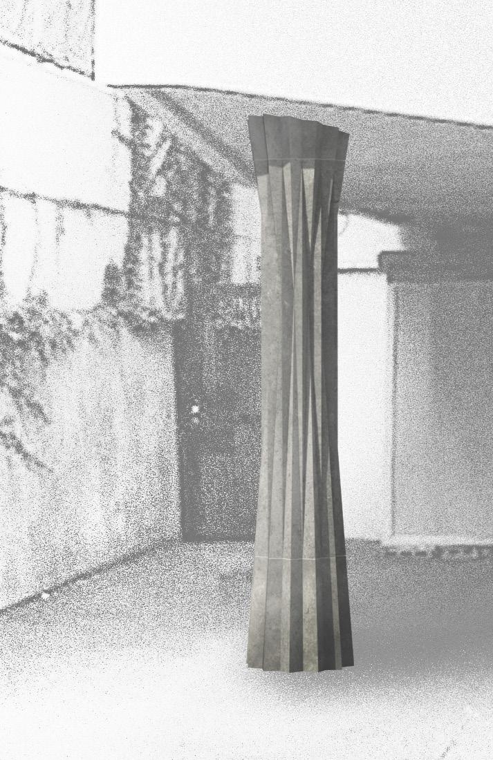 Inspired by Japanese origami, and the research of J. Choma and E. LloretFritschi, our project seeks to perfect a system of concrete formworks by simply using folded paper membranes and corrugated cardboard supports to cast column components. The interest in using recyclable paper products as the basis for our formwork system is both pragmatic and conceptual. The paper formworks are lightweight, with folded geometries that stiffen the paper sleeve to resist hydrostatic pressure. The cardboard exoskeleton acts both as a support cage for the sleeve which helps with buckling deformations, and as a guide for the paper sleeve to “lock” into place for ease and speed of assembly. Using wood fiber based recyclable products allows us to design three dimensional formworks, which can be flat packed into a fraction of the volume and material weight (compared to steel and timber) and unfolded on site. In contrast to traditional formwork systems, the reduced weight and profile of the paper formworks make it easier to transport and deploy, reducing the embodied emissions for transportation and time for setup. After casting, the majority of the formwork can be reused, reclaimed, or recycled. Paper formworks are a unique low cost, low emission strategy for producing beautiful, and seemingly unexpected delicate structural concrete forms.