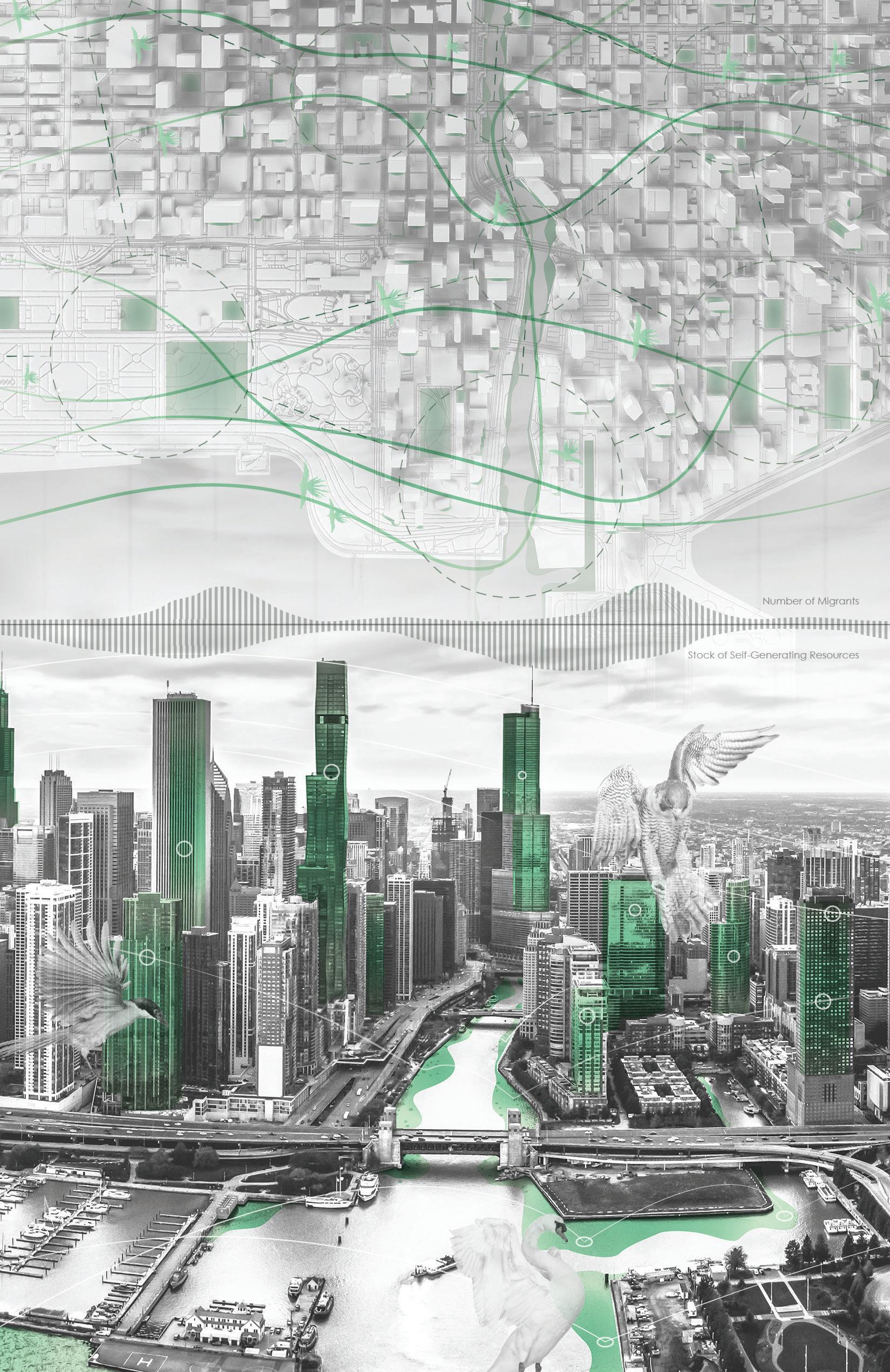 Migratory birds move through the city only briefly each year. This thesis proposes a distributed network of architectural habitats grafted with everyday urban spaces. Narrowing the focus to Chicago, floating wetland-like structures in the water bodies provide resting grounds for waterfowl and support aquatic life below, while roof perching-gardens and foldable shelter façades offer vegetation, insects, and spaces to rest across the city.