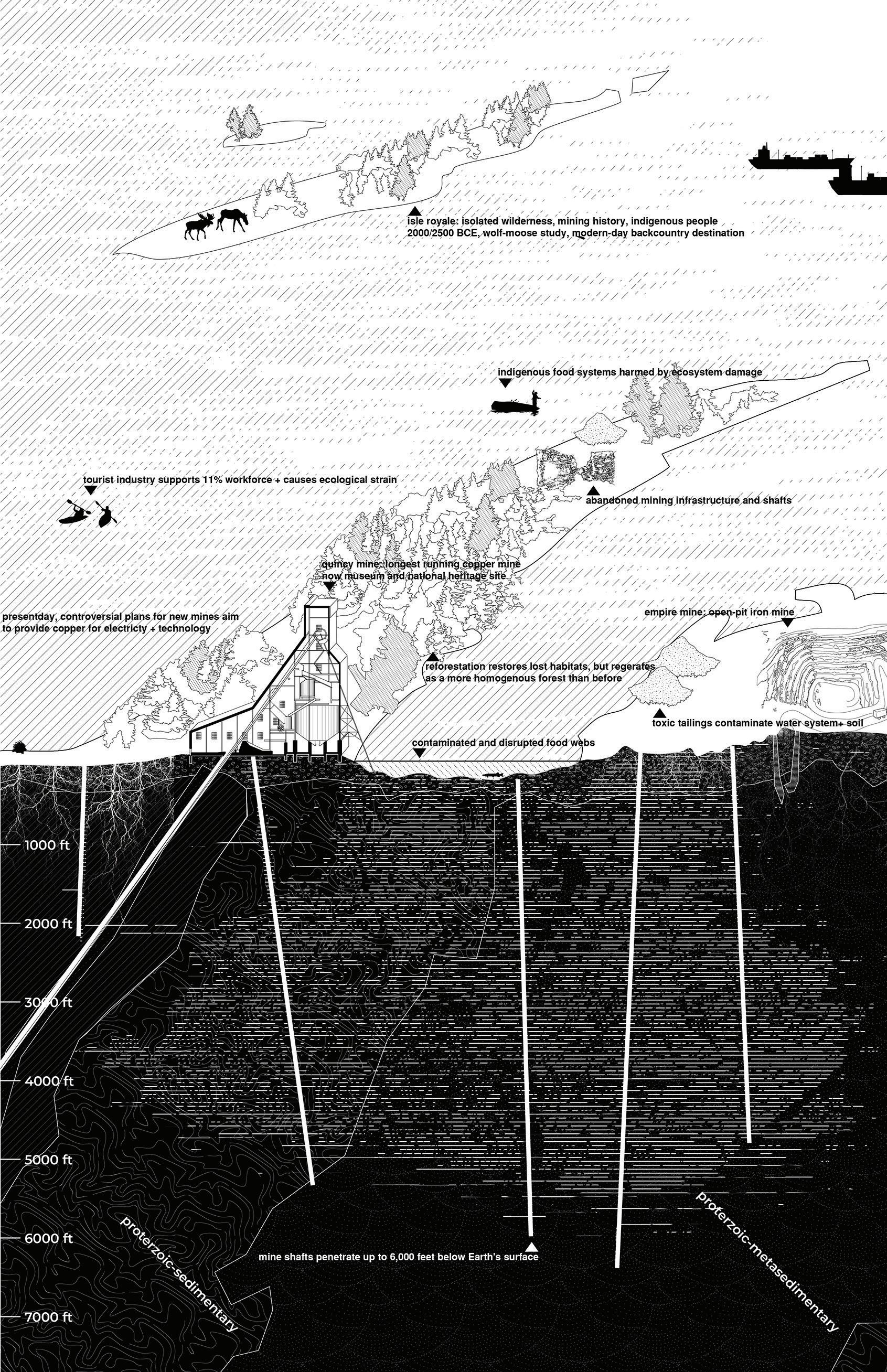 Today, the Upper Peninsula faces a convergence of conditions: an aging and declining population, widespread absentee and foreign land ownership, and renewed speculation around reopening copper and nickel mines driven by demand for “green” technologies. Its branding as a climate refuge risks triggering new waves of investment that repeat historical patterns of exploitation. This thesis treats these pressures not as isolated problems but as a critical moment for anticipatory planning, asking how architecture might intervene before another cycle of irreversible transformation solidifies.
