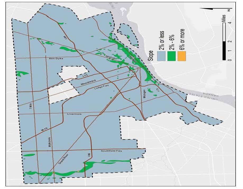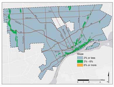 The glacial and soil deposition processes, along with broader climate characteristics, also played a role in determining the vegetation makeup of the region. Categorized as the mesic southern forest, pre-settlement Detroit experienced the presence of beech and sugar maple dominant communities. These species do especially ell on fne-textured glacial till and sandy lake plains that are well drained, conditions that were previously established in this area. Soils are generally fertile with high nutrient content and soil organism content, due to the decomposition of deciduous leaves and branches. Where drainage is poorer and seasonal pools are common, a wetter habitat was formed, favoring beech and an oak-hickory mix.8 Along the eastern border of the city, as well as in the southwest, there were historically much wetter, swamp and marsh conditions. To this day, these areas remain more prone to fooding than other parts of the city.