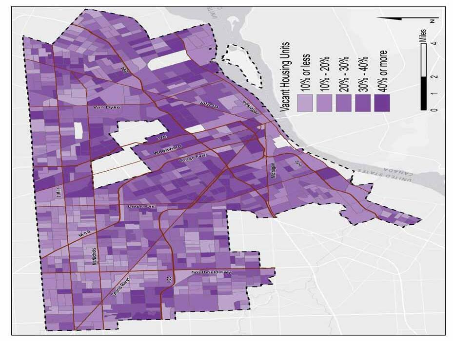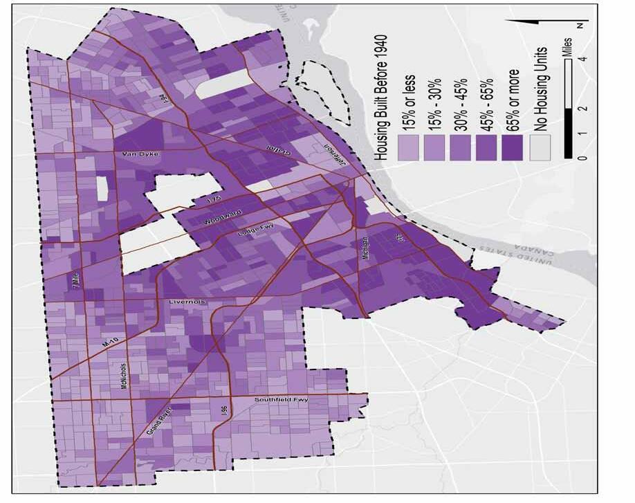 Detroit’s meteoric rise and decline has created unique challenges for the urban environment. The city’s prosperous industrial economy allowed blue-collar autoworkers to purchase their own single-family homes, and Detroit became well known as a city of “house and yard” people.10 Once a symbol of prosperity, many of Detroit’s homes today lack insulation and modern, energy effcient H AC systems. Also, Detroit was built at a time when auto-ownership was on the rise, and the city’s planning professionals favored an auto-dependent urban form. In 1958, the city shut down the last of its streetcars, while highways were constructed throughout the city. Today, Detroit faces the
