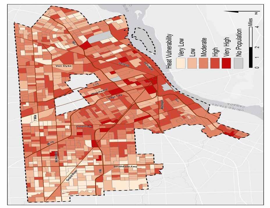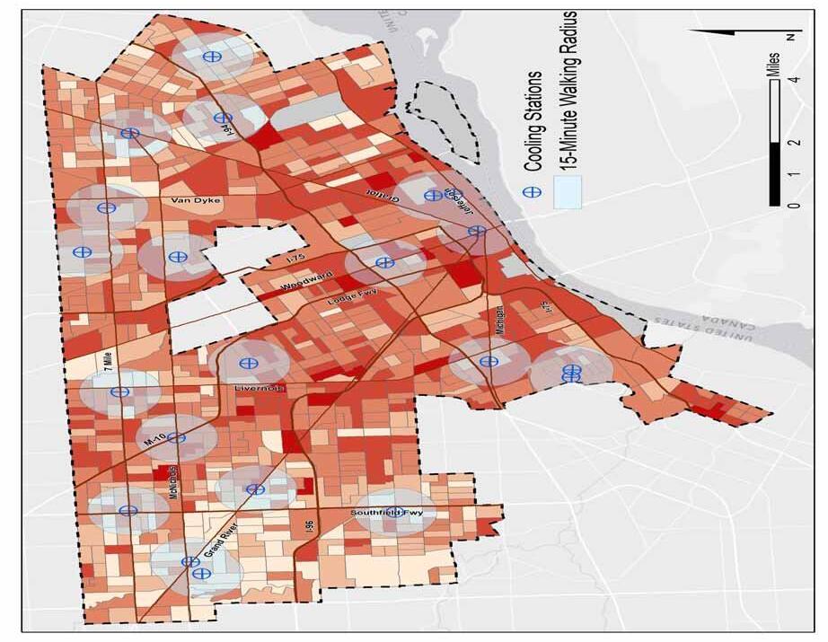 The heat assessment indicates that the greatest areas of vulnerability include the downtown core, along with the adjacent neighborhoods northwest of downtown. In addition, only 29% of the population is within a 15-minute walking distance of designated cooling centers, which the City of Detroit designates on an annual basis.