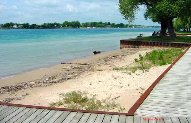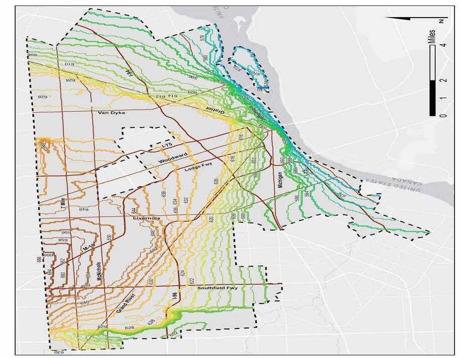 The other surface type that is apparent is derived from the deposition of lake sediments. As the Great Lakes began to fll, they ere not always the shape that we know today. In fact one in particular, Lake Maumee, encompassed an area that included part of present-day Lake Erie, Lake St. Clair, the Detroit river, and inland parts of Canada and Michigan. Lake dynamics are such that sediments will accumulate over time, carried by rivers, wind, and erosion to the lake. Sand and gravel tends to accumulate along the outer portion of the lake, hile fner silt and clay sediments will settle in the inner, deeper lake areas.5 Detroit and the surrounding area has a presence of both types, though silt and clay predominate in the sections closer to the Detroit River.