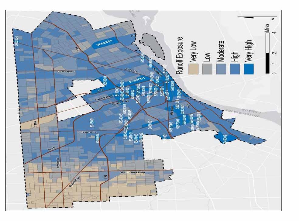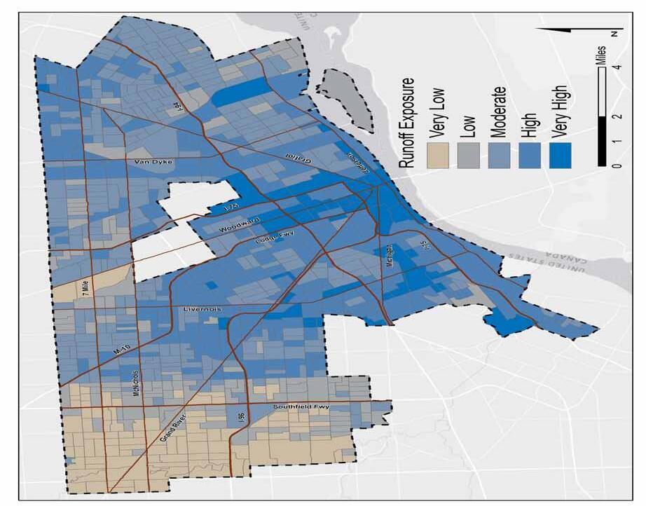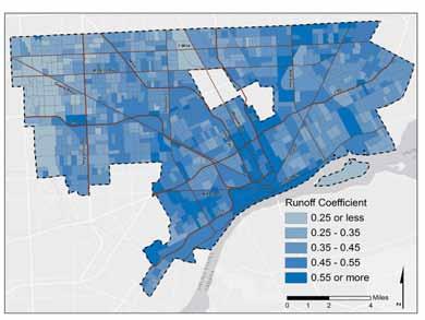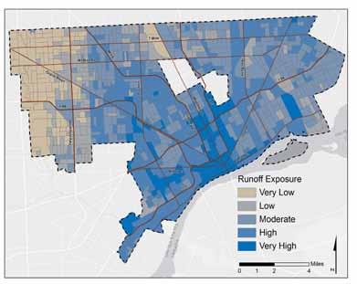 With regard to infrastructure, the analysis focuses solely on exposure factors. The primary exposure factor includes the runoff burden created during intense storm events. Land cover, soil type, and slope are the three factors that determine runoff burden. Data pertaining to the age, size, capacity and technology of existing infrastructure is necessary to determine the sensitivity of the City’s nine sewersheds. Additional information from Detroit Water and Sewerage Department is necessary for a more comprehensive analysis.