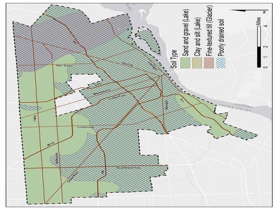 A key impact of these historic geologic processes is Detroit’s most common current soil types—soils produced from glacial outwash, and soils derived from deposited lake sediments.