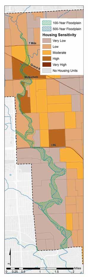 At the household level, the exposure factor is determined from foodplain designations (100 and 500 year). Age of housing stock (pre-1940) and median household income constitute household sensitivity.