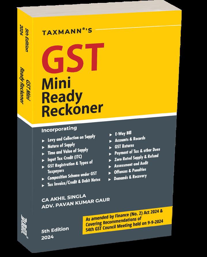 This book serves as a concise and comprehensive guide that simplifies the complexities of Goods and Services Tax (GST) for newcomers and seasoned professionals. It o ers a step-by-step approach to understanding the GST framework, covering essential topics. By incorporating practical tools like examples, FAQs, flow charts, and diagrams, the book makes even the most complex concepts easy to grasp. This guide is beneficial for beginners, students, and professionals who seek to understand GST concepts in a simplified and accessible manner. The Present Publication is the 5th Edition and has been amended by the Finance (No. 2) Act, 2024. It covers the recommendations of the 54th GST Council Meeting held on 09-09-2024 and is authored by CA. Akhil Singla and Adv. Pavan Kumar Gaur, with the following noteworthy features: