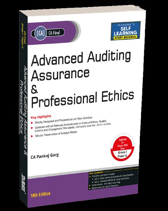 Advanced Auditing, Assurance & Professional Ethics is a comprehensive and exam-oriented self-learning text for CA Final – Group I | Paper 3, applicable for the January 2026 examination. This 16th Edition provides complete coverage of auditing standards, assurance engagements, quality control, and professional ethics, incorporating all amendments in force up to 31st October 2025. It aligns with ICAI’s latest updates, including the Code of Ethics, Quality Management Standards (SQM 1 & 2), and revised SAs (200–720 series). The book seamlessly blends conceptual learning with practical application through illustrations, case studies, charts, and tabular analyses, providing a structured self-learning experience that progresses from fundamentals to exam preparation.