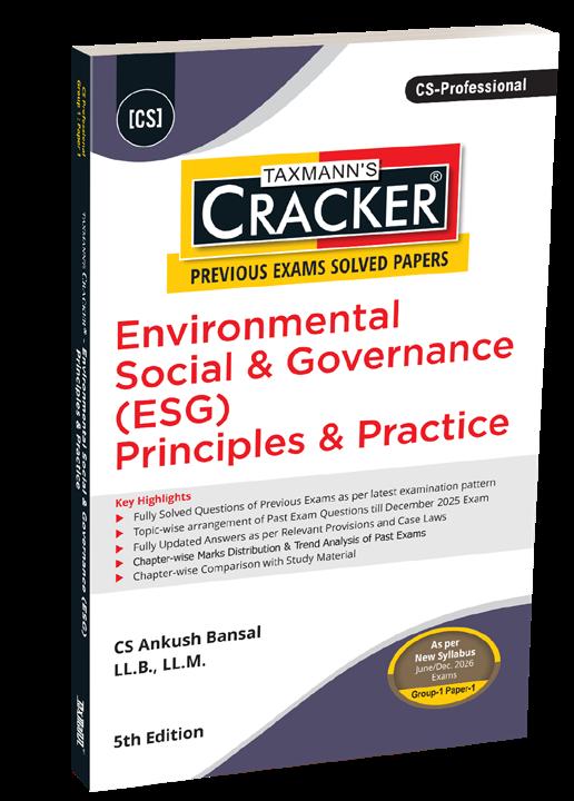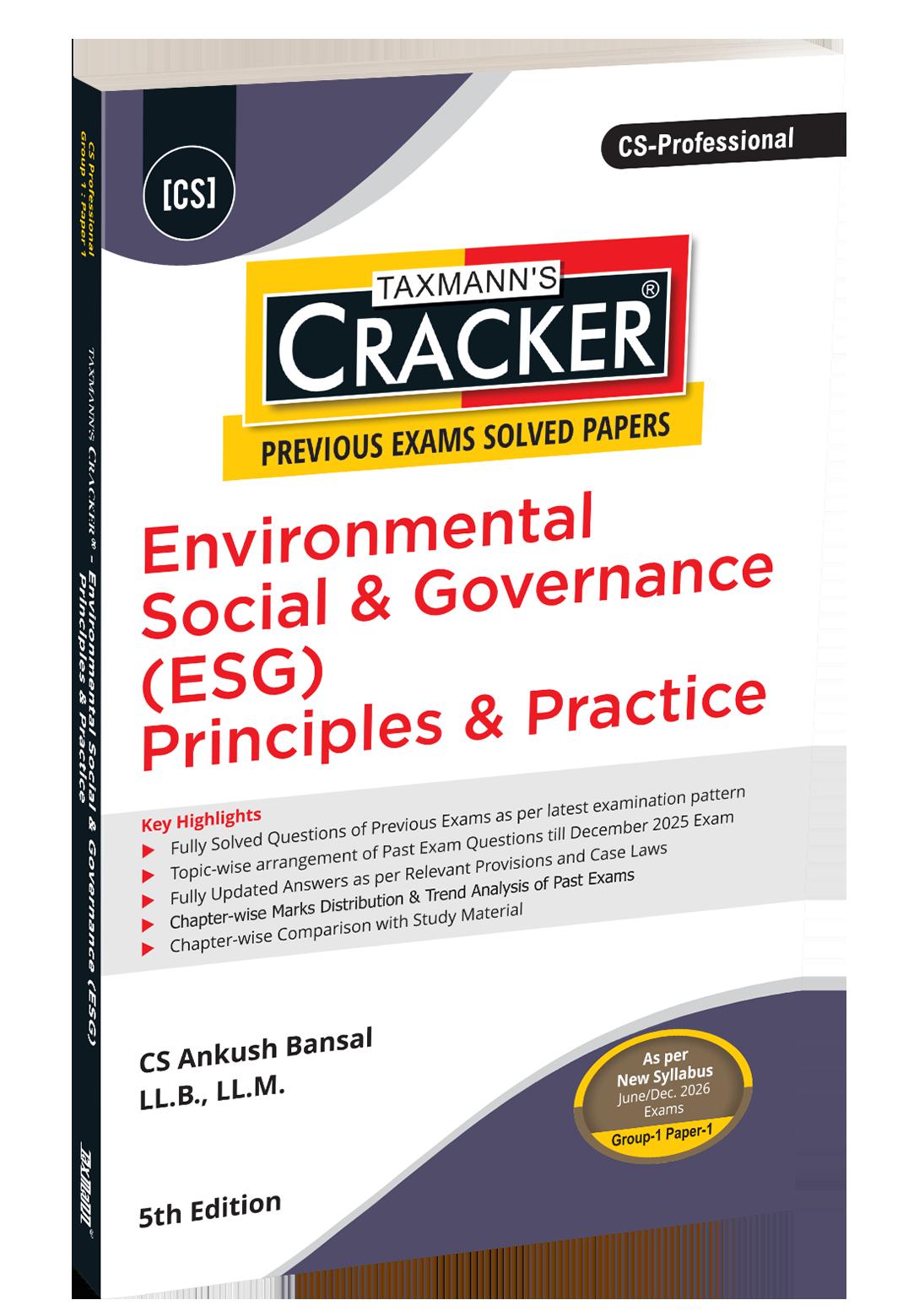 Environmental, Social & Governance (ESG) Principles & Practice – CRACKER is a rigorously exam-oriented manual for CS Professional – Group 1 | Paper 1, designed to mirror ICSI’s actual examination approach to ESG. The book presents ESG not as a theoretical sustainability concept, but as a governance, compliance, reporting, and risk-management discipline, fully aligned with the New ICSI Syllabus and applicable for the June/December 2026 examinations. Through systematic use of past examination questions, model answers, marks-weightage analysis, and Study Material mapping, the book enables students to understand both what to study and how ESG is tested in the CS Professional examination framework.