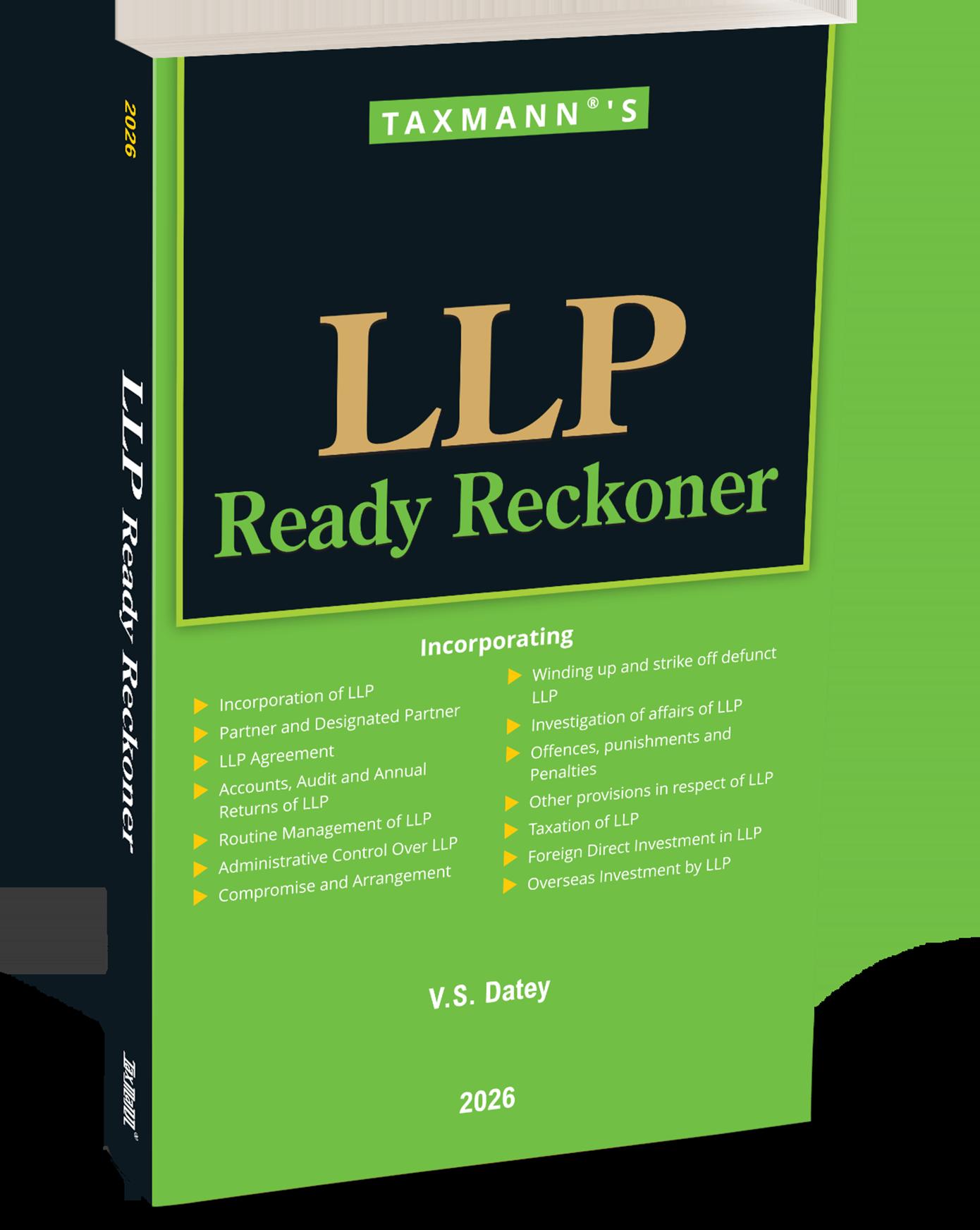 The LLP Ready Reckoner is a concise yet authoritative, practice-oriented reference on the law governing Limited Liability Partnerships (LLPs) in India. Designed as a true ready reckoner, the book provides quick and reliable guidance on legal, procedural, and compliance issues across the entire LLP lifecycle—from incorporation and governance to restructuring, investigation, taxation, cross-border investment, and exit. Updated to reflect the law as stated, this Edition reflects the post-amendment LLP framework following the LLP (Amendment) Act 2021. The book goes beyond statutory reproduction to explain how LLP law operates in practice, making it a dependable desk reference for professionals and a structured guide for learners. This publication is beneficial for: