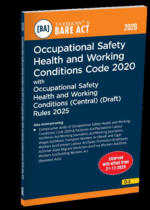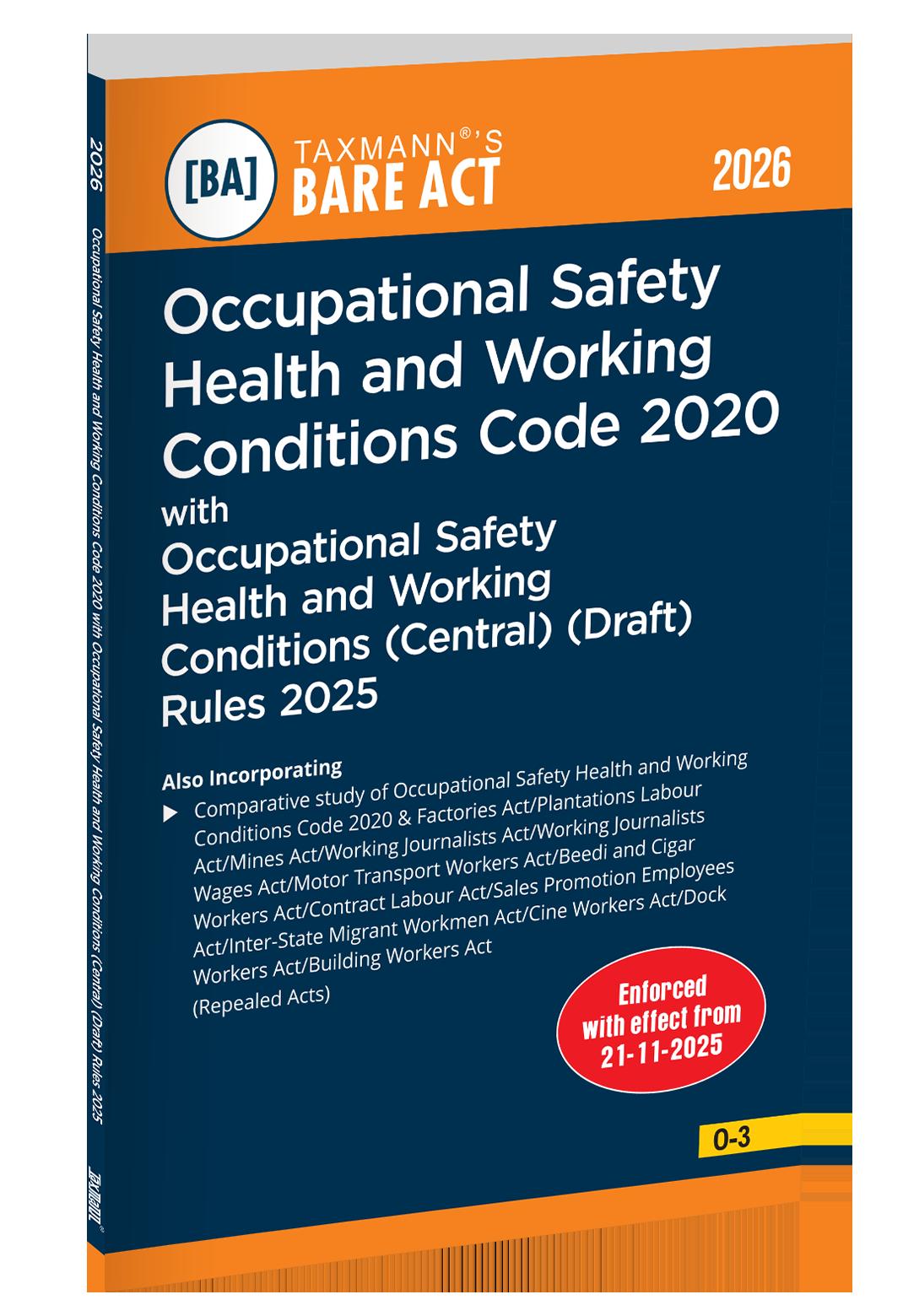 Occupational Safety Health and Working Conditions Code 2020 with Occupational Safety Health and Working Conditions (Central) (Draft) Rules 2025 [Bare Act with Comparative Study] by Taxmann is a comprehensive statutory and transition reference on India’s consolidated legal framework governing workplace safety, health, welfare, and working conditions. This publication is specifically designed to address not only the text of the new law, but also its structural transition from the repealed enactments. The inclusion of a systematic comparative study enables readers to trace Code provisions to their legislative origins, identify substantive changes, and assess compliance implications. Consequently, the book functions as a transition and interpretation manual, rather than a conventional Bare Act, assisting stakeholders in realigning compliance systems, policies, and advisory frameworks under the Code-based regime.