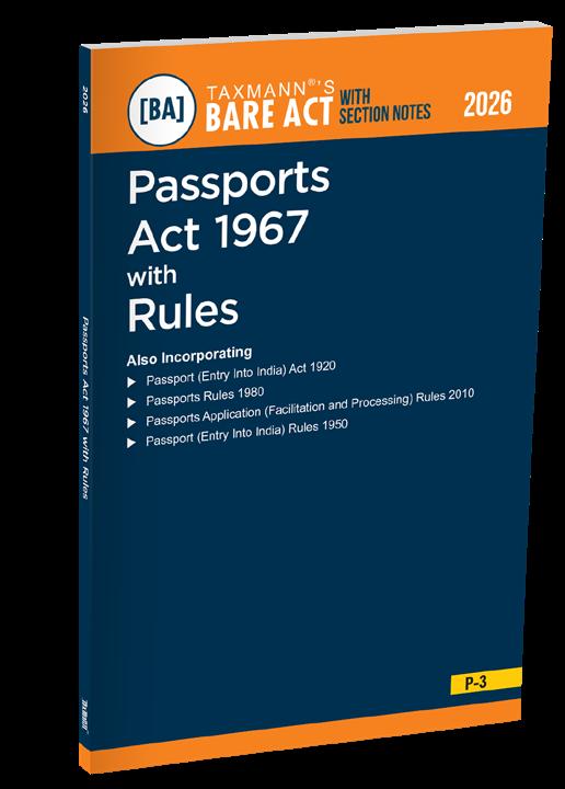 Passports Act 1967 with Rules [Bare Act with Section Notes] by Taxmann is a concise and authoritative statutory compilation presenting the complete and updated text of the Act, together with the relevant Rules and allied legislation governing passports and travel documents in India. The publication incorporates all amendments and notifications in force, ensuring statutory accuracy. Alongside the verbatim law, it provides clear, section-wise notes that explain key provisions, procedural requirements, and the scope of executive powers, making it a reliable guide to the legal framework governing the issuance, refusal, impounding, suspension, revocation, and regulation of passports.