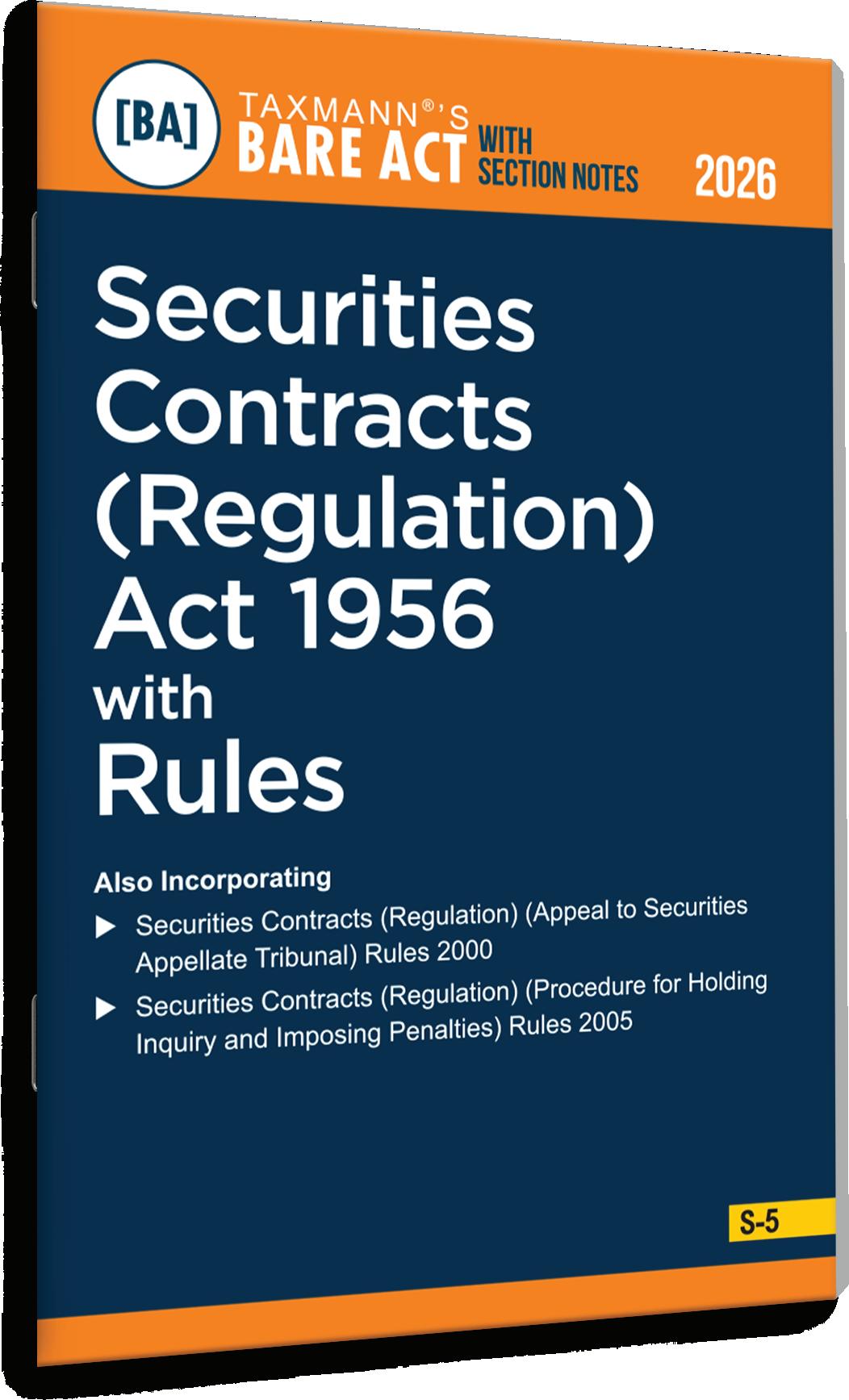 Securities Contracts (Regulation) Act 1956 with Rules [Bare Act with Section Notes] by Taxmann is an updated Bare Act on India's statutory framework for regulating securities markets, stock exchanges, and securities contracts. It compiles the principal Act with amendments, allied rules, and statutory notifications covering trading, listing, derivatives, penalties, and enforcement. The book reproduces the complete, amended text of the Act, supported by crisp section-wise notes that explain the intent and application of each provision. It serves as a reliable single-point reference for core aspects such as recognised stock exchanges, corporatisation and demutualisation, listing/delisting, SEBI's powers, adjudication, and appellate remedies. This book is intended for the following audience:
