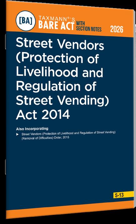 Street Vendors (Protection of Livelihood and Regulation of Street Vending) Act 2014 [ Bare Act with Section Notes ] by Taxmann is an updated and authoritative statutory publication presenting the complete text of India’s principal law governing urban street vending. The book combines verbatim statutory provisions with well-structured section notes, commentary, and judicial references, offering a clear, practitioner-oriented understanding of the legal framework that protects street vendors’ livelihoods while ensuring regulated, orderly urban spaces. Going beyond a conventional Bare Act, this publication explains legislative intent, procedural requirements, institutional mechanisms, and practical application of each provision. It also incorporates applicable State amendments, relevant judicial interpretations, and the Street Vendors (Protection of Livelihood and Regulation of Street Vending) (Removal of Difficulties) Order 2015, enabling readers to stay aligned with the evolving regulatory landscape governing street vending in India.