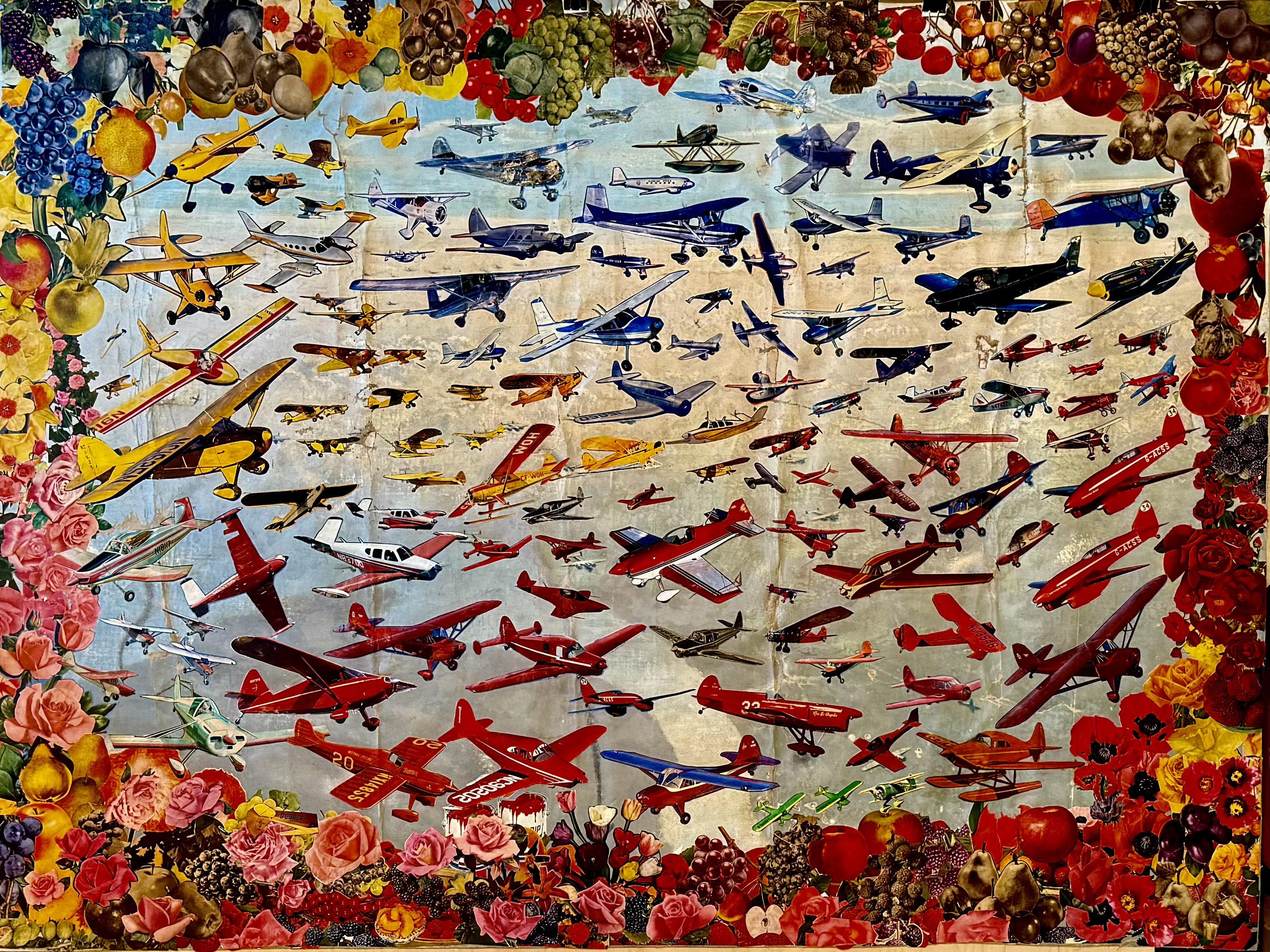 The exhibition’s title comes from a large-scale work made from a salvaged, unstretched canvas that Letscher encountered and immediately envisioned as a vast expanse of sky. A myriad of planes of varying size are suspended in the center of the canvas, bordered by a vibrant array of flora and fruit. For Letscher, airplanes offer a familiar visual vocabulary rooted in childhood memories of watching planes cross the sky, serving as a means to explore light, perspective, and spatial tension.