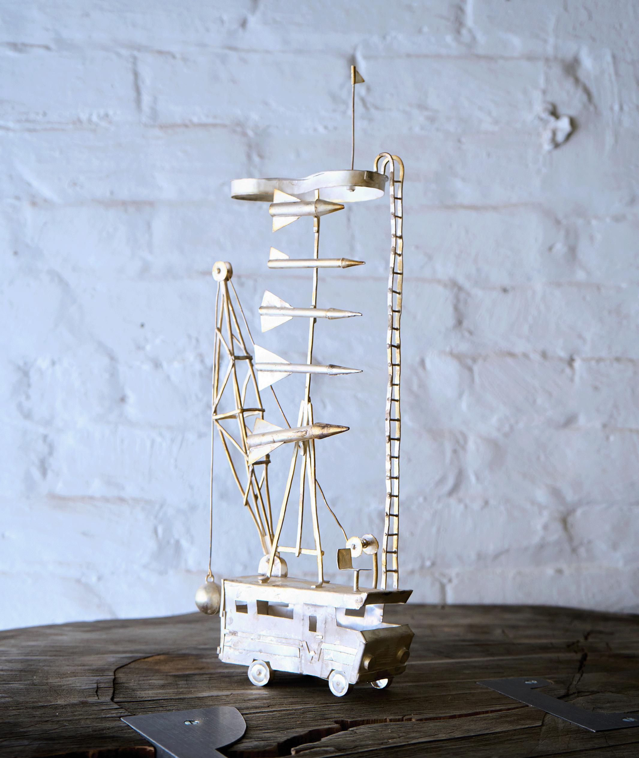 Ebonized walnut, nickle-plated and natural brass, hammered silver and blackened steel