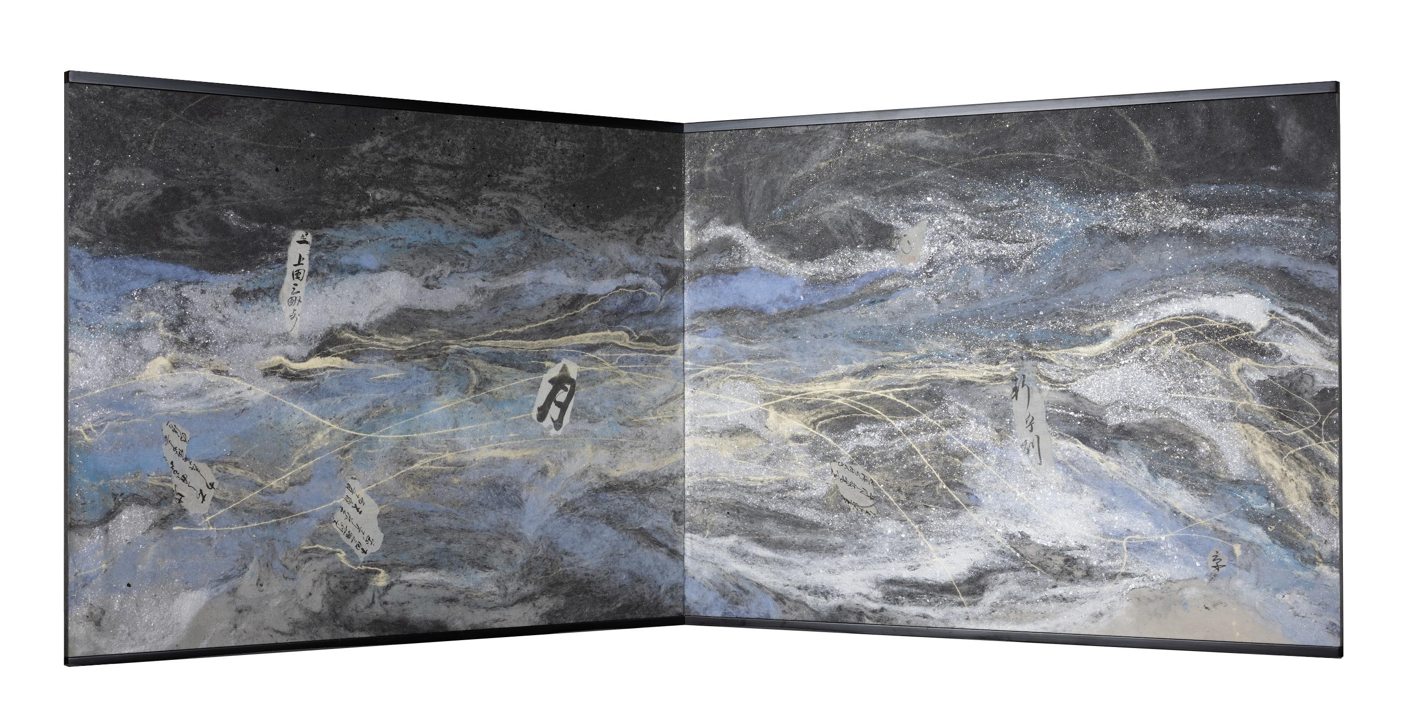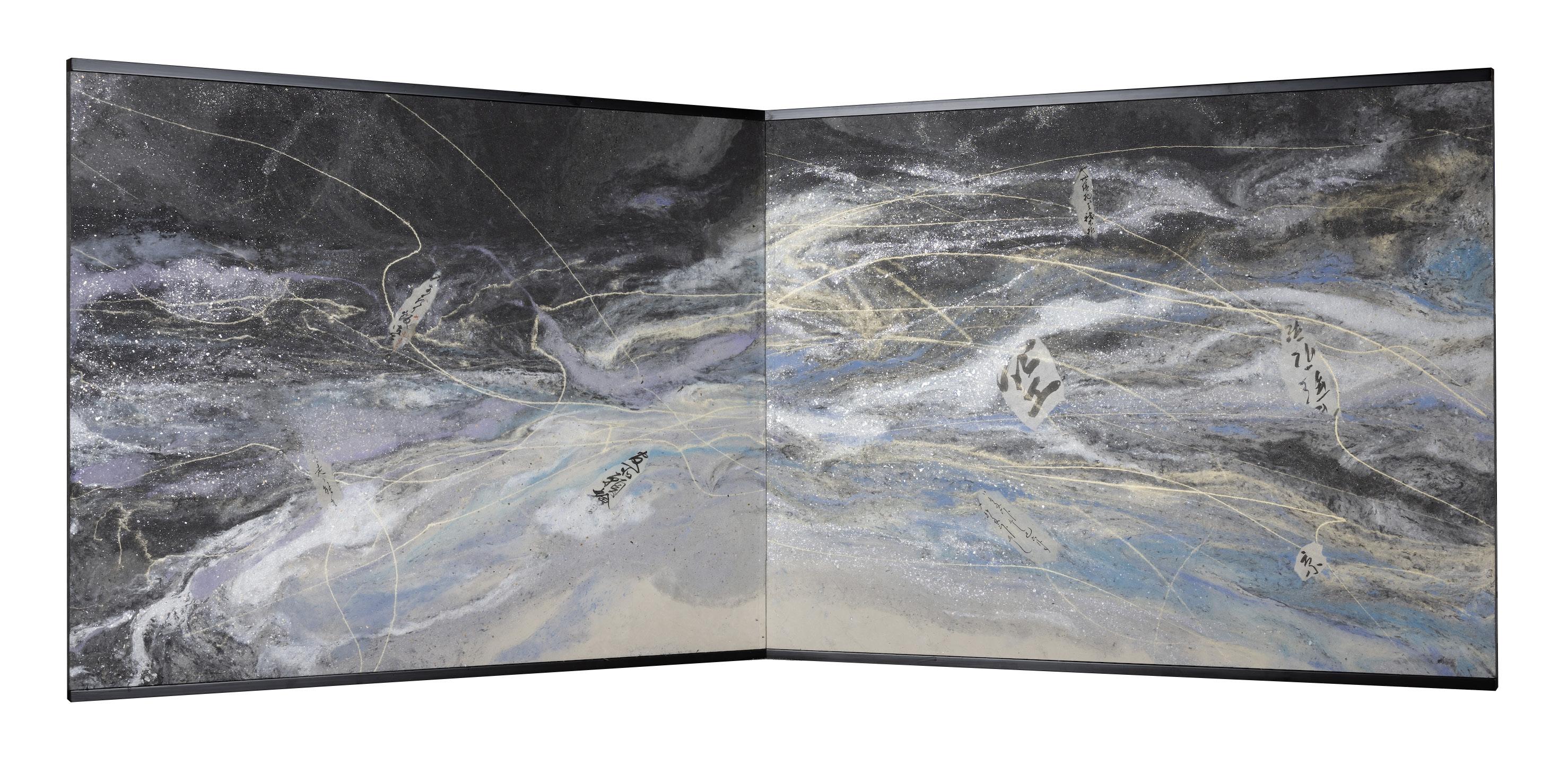 it, imparting a range of shades from light gray to black. She applies more and more water, allowing the pulp to assume a life of its own in a response to raw materials—with its roots in both Shinto animism and the Buddhist quest for unity with nature— that is fundamental to traditional Japanese culture. Blending with the microfibers of the support, the molten mass forms atmospheric compositions that range from near-representational—evoking the night sky, a stormy sea, or a distant mountain range—to near-abstract, with added touches of mica, mineral pigments, indigo dyes, or ink intensifying the screens’ visual impact.