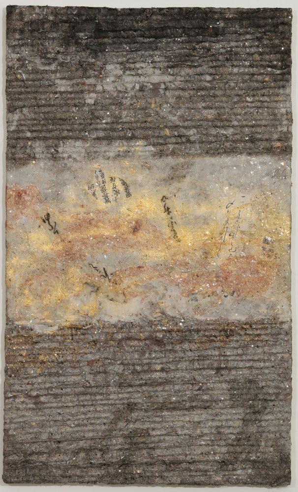 TEN CHI JIN (HEAVEN EARTH HUMAN), 2013 Recycled gampi paper fiber, old documents, mica and sumi on panel 29 3/4 x 17 3/4 inches