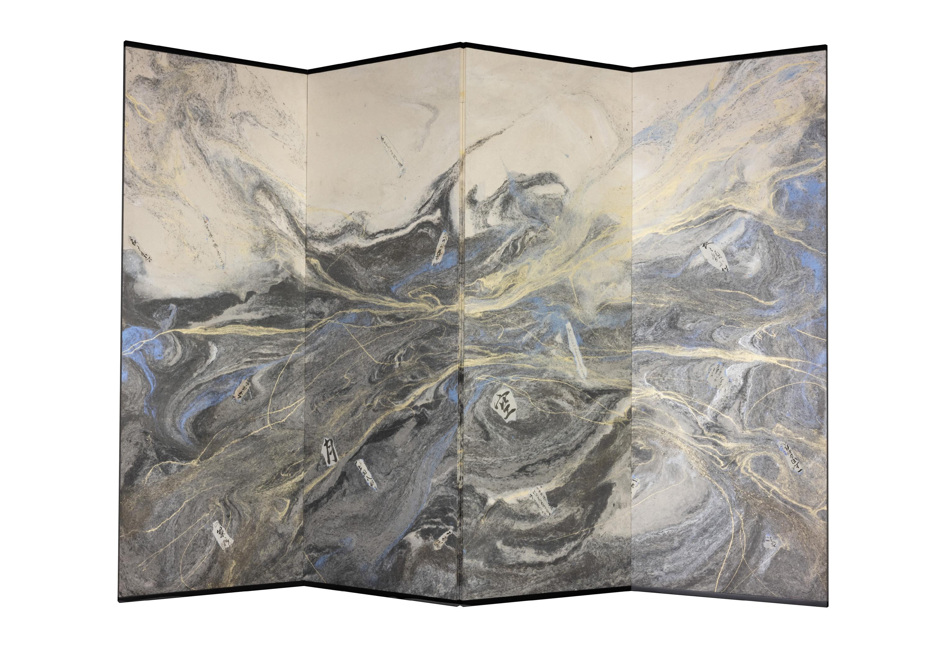 Four-panel folding screen, double-sided work; recycled antique ganpi paper fibers, ink, document fragments, mica, mineral pigments and gold