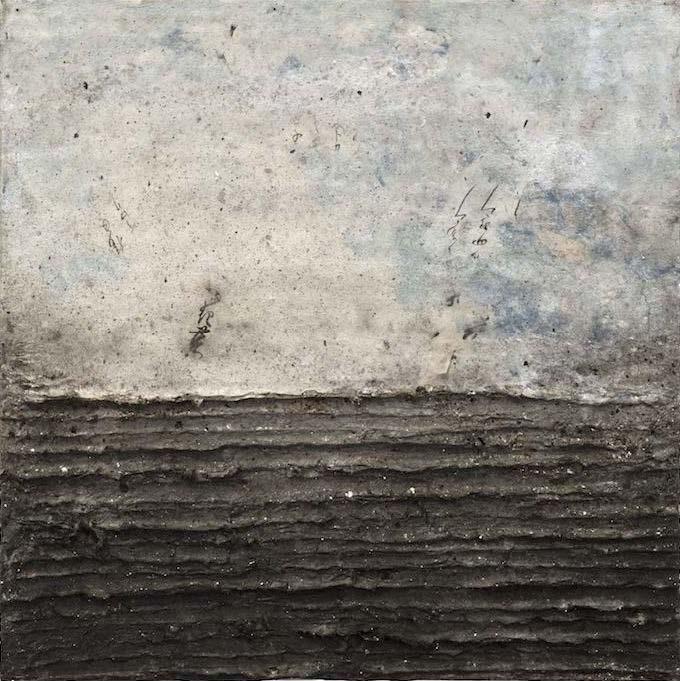 Hogosho, old paper, sumi, mica, and natural indigo on panel 18 x 18 inches