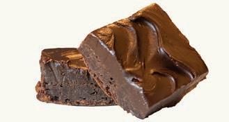 A rich brownie topped with fudge icing.