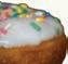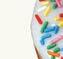 Yeast donut topped with white icing and rainbow sprinkles.