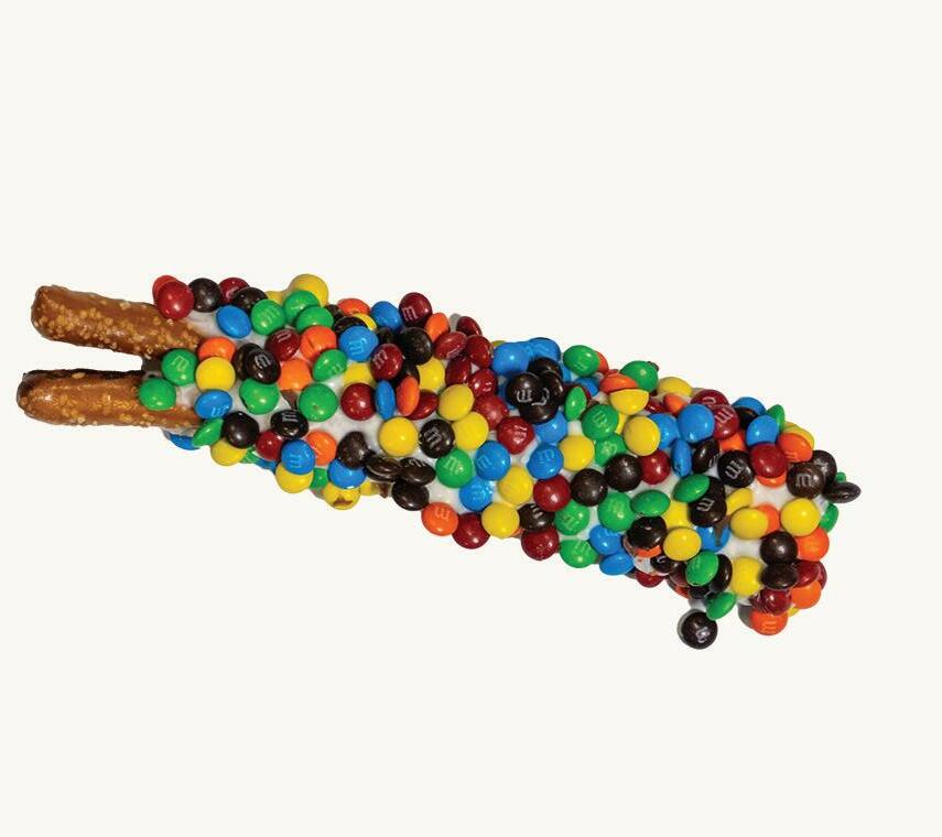 Salted pretzels dipped in milk chocolate and smothered mini M&M®’s. 12 oz.