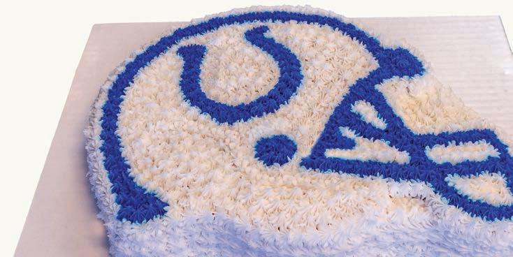 *The trademarks “Colts,” “Indianapolis Colts,” and the Colts’ horseshoe logos are the property of Indianapolis Colts, Inc. Taylor’s Bakery has obtained permission and is authorized for the creation of cakes featuring the horseshoe and helmet shapes resembling the Colts’ logos. *Consent is required and must be granted in advance for Colts logo to be used in written form or printed as an edible image.