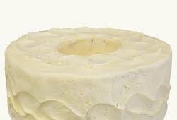 A light white angel food cake with fluffy white icing.
