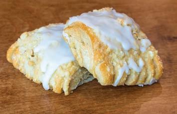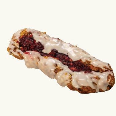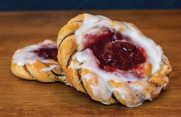Danish dough swirled with cinnamon, topped with cherry filling and white icing.