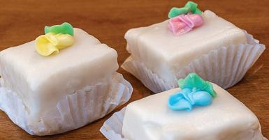 A simple cooked white icing is poured over our famous white cake and served in 2-inch squares. Each petit four comes wrapped individually in it’s own paper. You’ll find rosebuds and seasonal decorations available in-store and ready to go. You can also pre-order with custom designs.