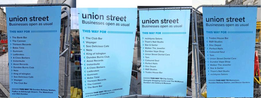 The Signshop was asked to create signage to be installed on the Heras fence around the works on Union Street, advertising the businesses involved and providing directional signage for the shops along the street